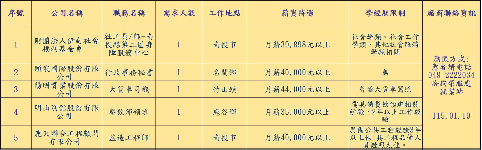 發布日期:115-01-19 資料來源:南投縣榮民服務處 【南投榮服處】廠商職缺表(115.01.19) 附件下載 檔案名稱 更新日期 下載次數 【南投榮服處】廠商職缺表(115.01.19).pdf 115-01-19 2