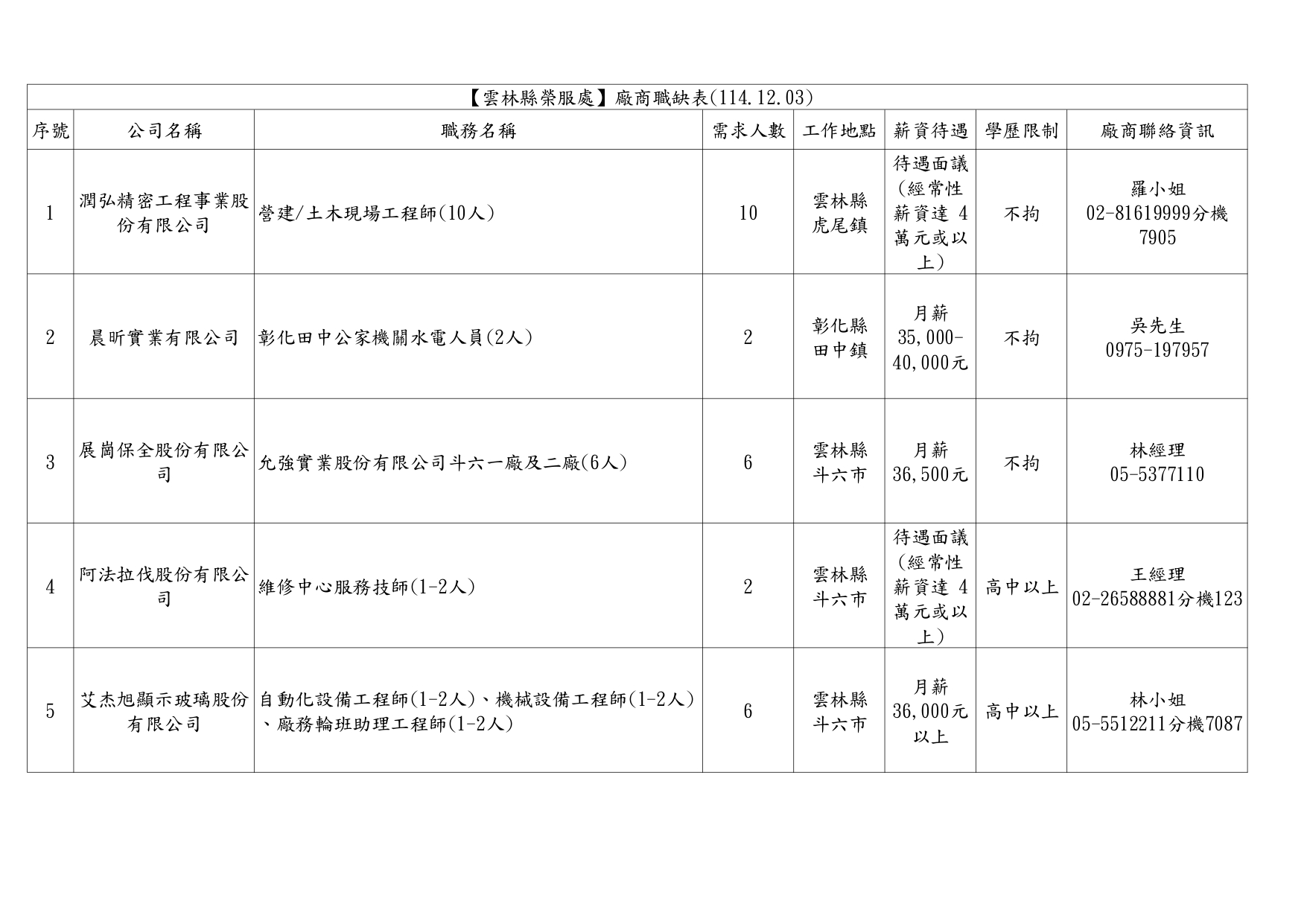 | 【雲林縣榮服處】廠商職缺表(114.12.03)+.pdf | 114-12-03 | 2 |
