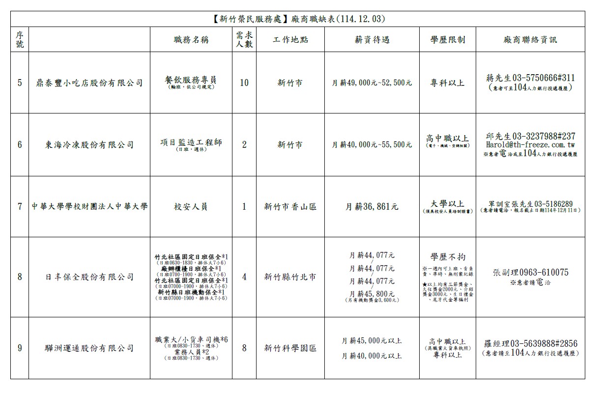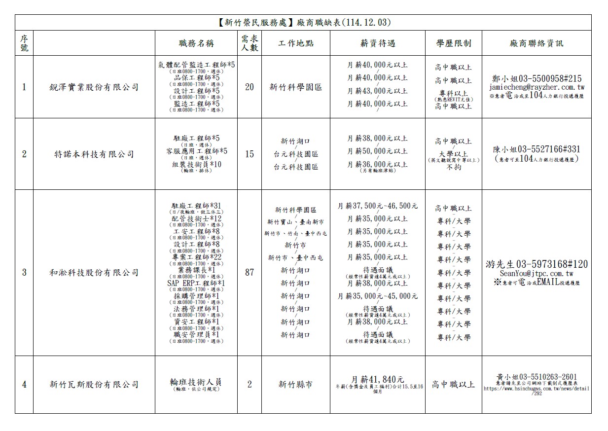 發布日期:114-12-03 資料來源:新竹榮民服務處 新竹榮服處廠商職缺表(114.12.03)【新竹榮服處】廠商職缺表(114.12.03) 相關照片 新竹榮服處廠商職缺表(114.12.03)-1 附件下載 檔案名稱 更新日期 下載次數 新竹榮服處廠商職缺表(114.12.03)--1.pdf 114-12-03 0
