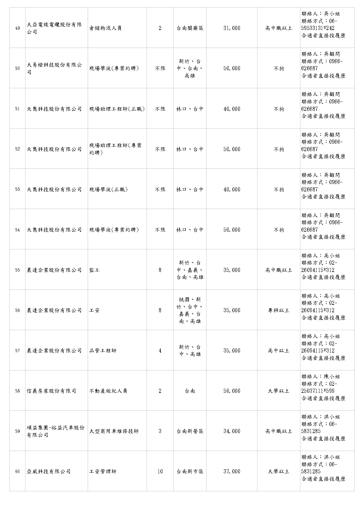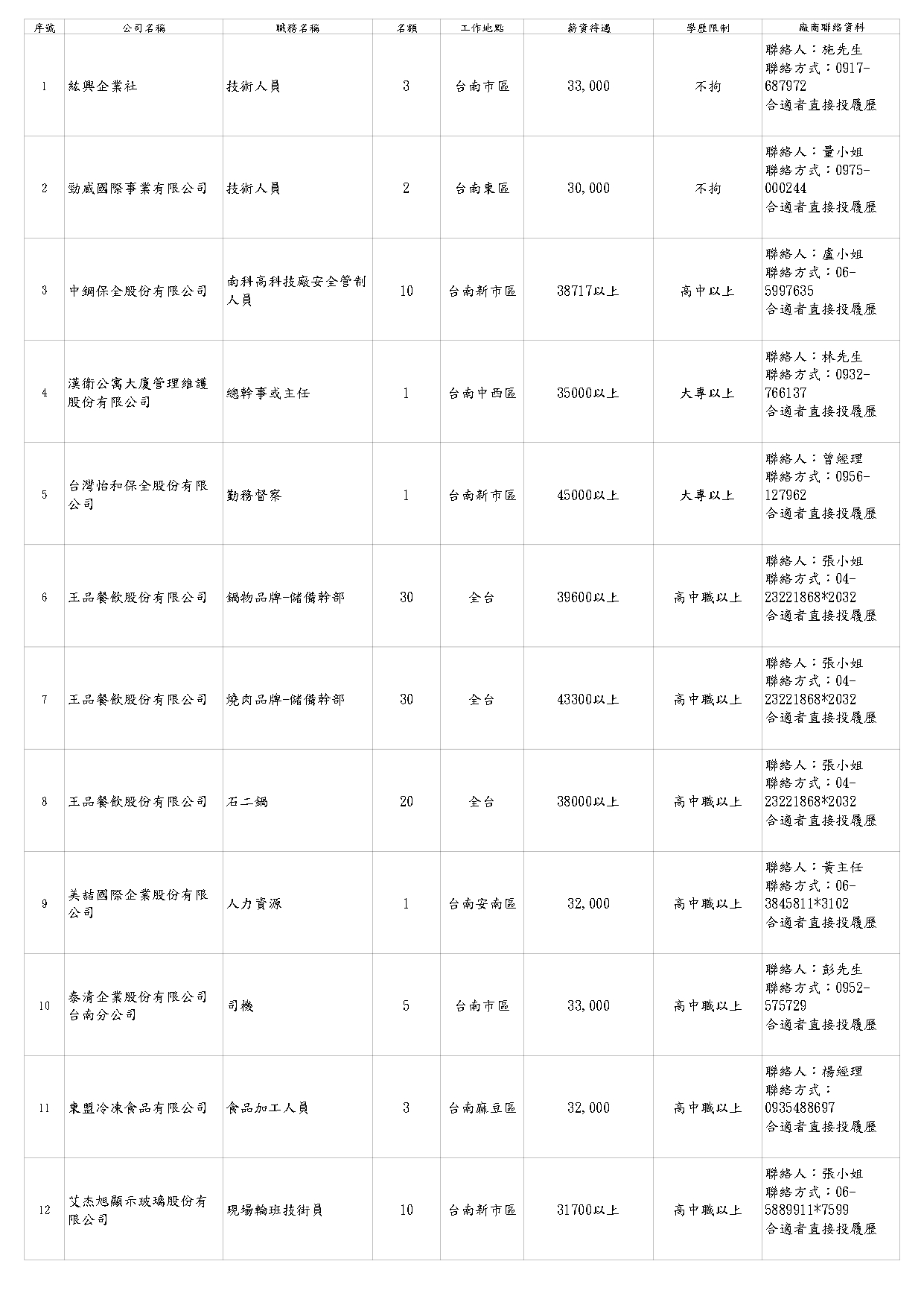 【臺南市榮服處】廠商職缺表(115.01.23)