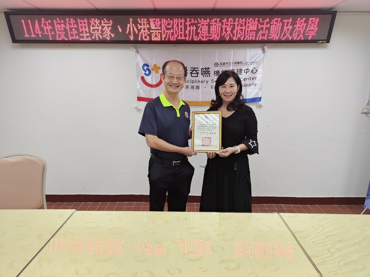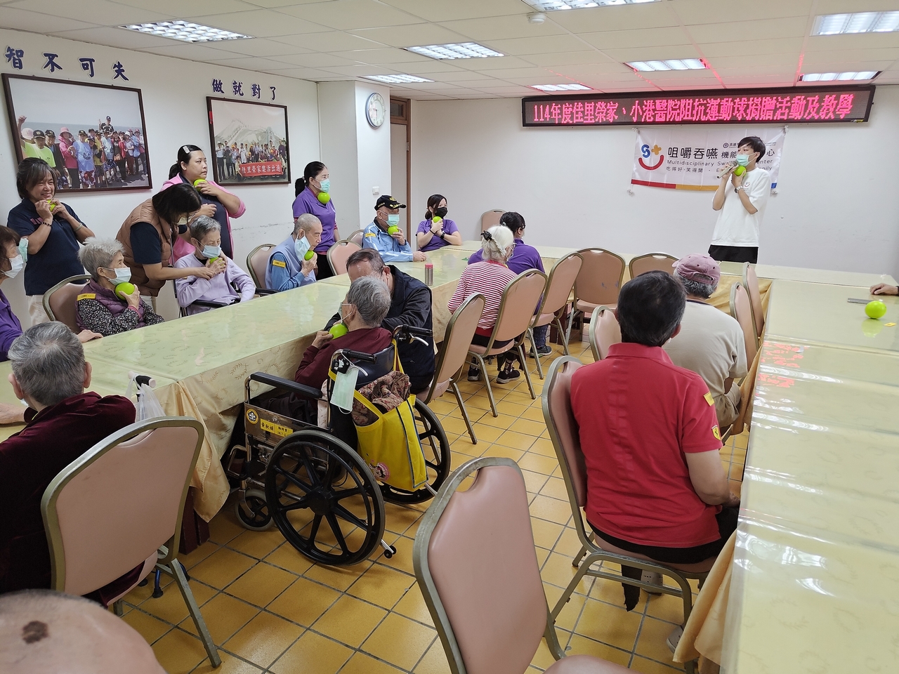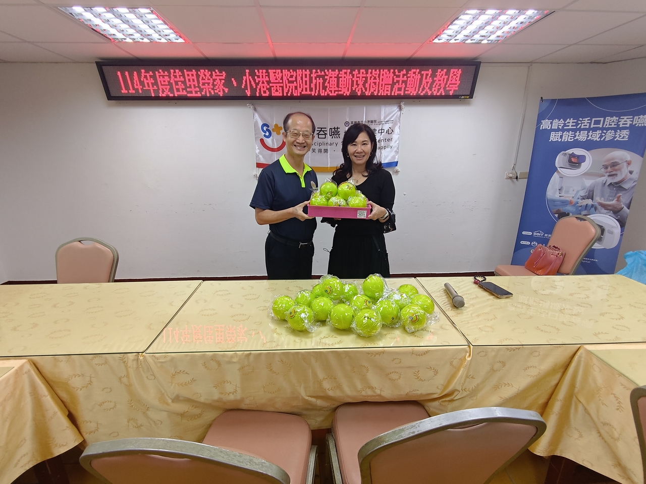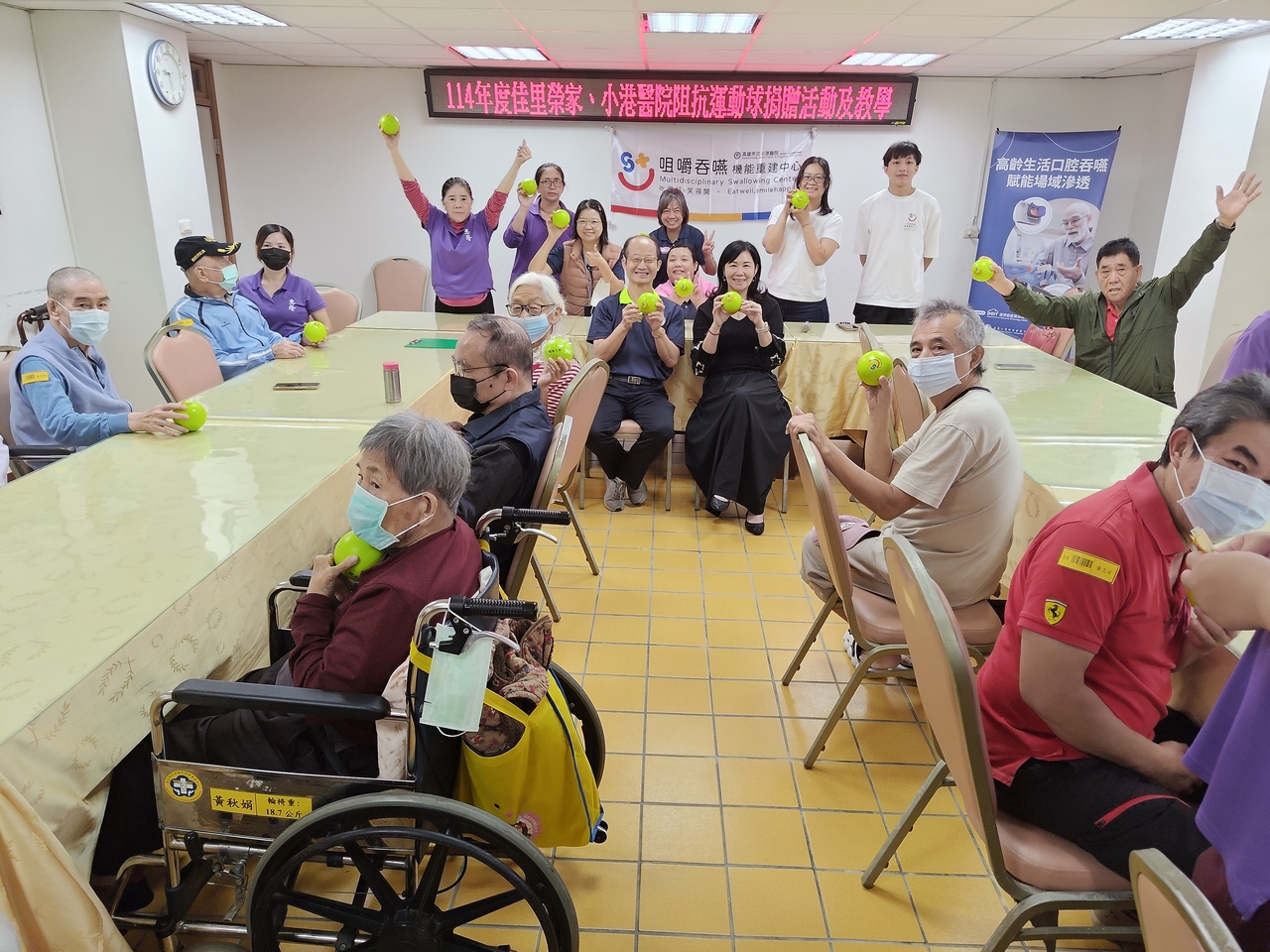 佳里榮家為提升長輩口腔保健及照顧品質,持續積極推動口腔衛生教育與健康促進相關活動,榮家喜獲高雄市立小港醫院捐贈阻抗運動球計30顆,活動當日計有榮家19名住民與13名工作人員參加,現場學習如何正確使用阻抗運動球進行下巴內縮抗阻力運動(Chin Tuck Against Resistance, CTAR),規律訓練可改善下巴與舌骨上肌群力量,進而提升咽喉期吞嚥效率,減少嗆咳頻率;對老衰族群與亞健康成人而言,CTAR 也可作為提升吞嚥肌力與預防吞嚥退化的訓練選項。 本次捐贈活動上現場由小港醫院副院長馮明珠致贈佳里榮家30顆阻抗運動球,現場工作人員與住民在捐贈儀式上開心合影,小港醫院工作人員表示,高齡者因老化及衰弱相關因素,常見咽喉部與舌骨上肌群的肌力下降與動作不協調,進而產生吞嚥障礙,當吞嚥功能退化時,容易導致嗆咳、吸入性肺炎、營養不良、脫水等併發症,並顯著增加住院率與死亡率;CTAR運動為近年常用於改善老年吞嚥功能的訓練方式之一,據研究顯示在亞健康族群、老年肌力退化者中,CTAR 運動可有效強化舌骨上肌與咽部相關肌群,促進吞嚥時的上提動作與食團通過咽部能力,本運動安全性高且操作容易;建議每日執行 30 次,一週五天,至少連續四週;現場榮家住民與工作人員跟隨語言治療師及教學影片示範,認真練習如何正確使用阻抗運動球。 佳里榮家主任陳宗貴表示,台灣於2025年邁入超高齡化社會,高齡長者咀嚼吞嚥功能及口腔衛生保健非常重要,尤其咀嚼吞嚥障礙者易導致長者營養不良、脫水、嗆咳吸入性肺炎,也是長者死亡率提高的因素之一,嚴重個案者甚至需裝設鼻胃管進食,導致生活品質下降,如嘗試復能,成功移除鼻胃管並恢復經口進食更是困難重重;因此,榮家透過早期健康促進,由衛教人員持續推動住民CTAR運動,讓住民保留或改善生理進食功能,預防或避免吞嚥障礙持續惡化,以期提升機構住民生活品質。