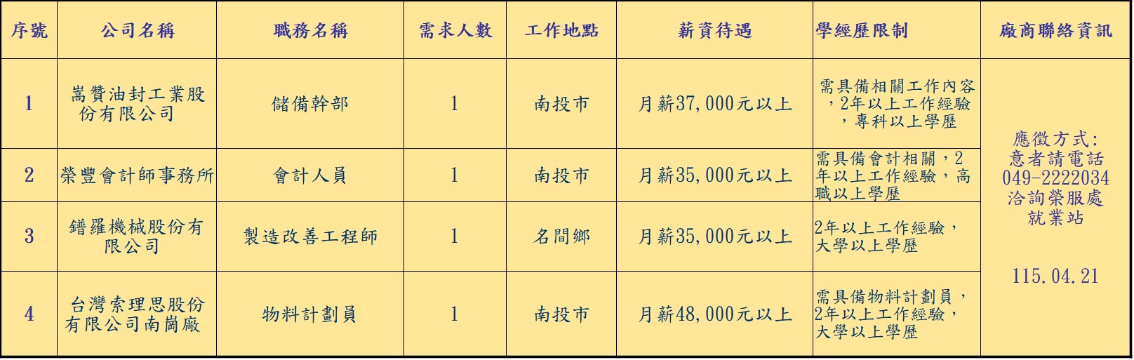 發布日期:115-04-21 資料來源:南投縣榮民服務處 【南投榮服處】廠商職缺表(115.04.21) 附件下載 檔案名稱 更新日期 下載次數 【南投榮服處】廠商職缺表(115.04.21).pdf 115-04-21 0