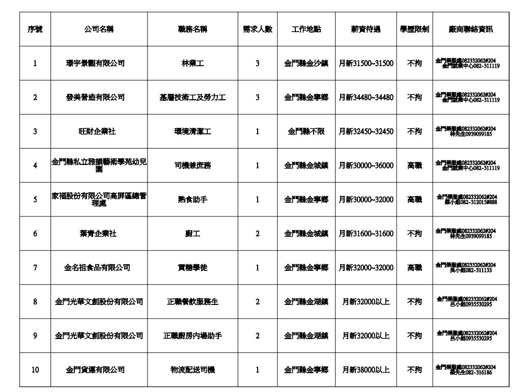 發布日期:115-01-09 資料來源:金門縣榮民服務處 【金門縣榮服處】廠商職缺表(115.01.09) 附件下載 檔案名稱 更新日期 下載次數 【金門縣榮服處】廠商職缺表(115.01.09).pdf 115-01-09 5