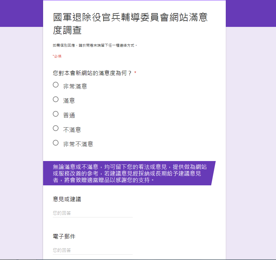 輔導會為精進網頁經營管理、增加與民眾互動,已於會本部及各服務、安養機構網站增建全球資訊網滿意度調查及民眾意見互動模式系統,並於本(106)年11月1日正式上線啟用,歡迎您不吝賜教給予我們建議與意見。