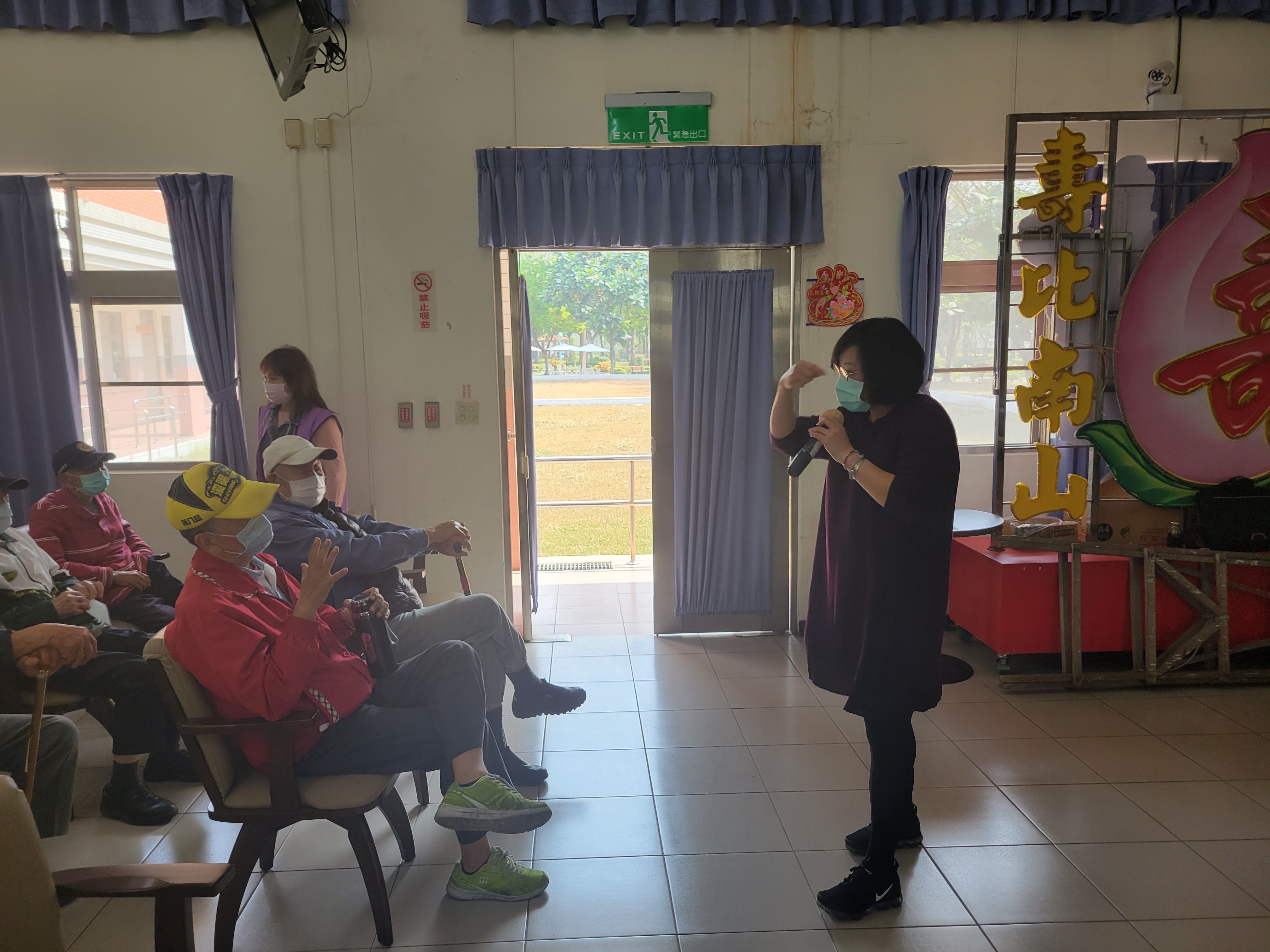 藉由安寧緩和宣導講座,推廣住民長輩用正向樂觀的心態面對生命,做自己生命的主人,邀請國軍左營分院張毓芬安寧共照護理師宣導安寧療護,保健組曾秋燕組長致詞並介紹講師,張護理師以親身經歷和與長輩互動輕鬆的方式授課,獲得長輩讚許與好評,並勉勵長輩們「白髮是榮耀的冠冕,讓老年生活有尊嚴、有品質」與「生命就像一本書,結局要和開始一樣美好」。