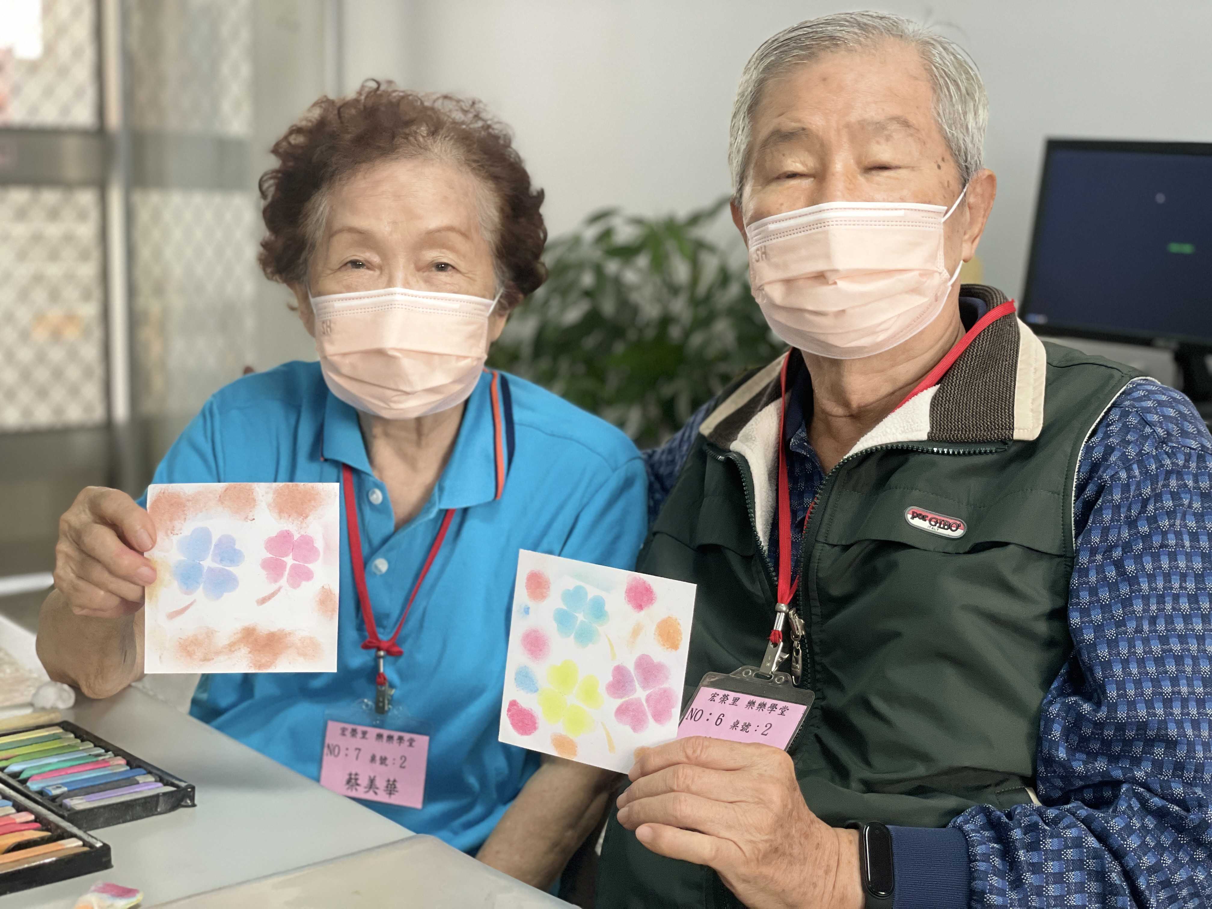 日前,高雄榮家結合楠仔坑圖書館到宏榮社區照顧關懷據點辦活動,邀請陳秋伶老師用簡單材料創作粉彩藝術,帶領長輩走入創作藝術世界。陳老師使用模板、濾網、粉彩筆、刷子、棉花球…等幾項簡單材料,教導長輩從最簡單的刮粉、韻染到取粉,簡單幾個步驟就完成「幸運草粉彩畫」。已經幾十年沒上過美術課的長輩們開心的說:「粉彩創作好像沒有想像中的困難,用手指頭點一點、橡皮擦擦一擦,粉彩畫就出來了,好像在幫自己『點胭脂』,沒想到自己這麼有天分竟能做出這麼漂亮的幸運草。」