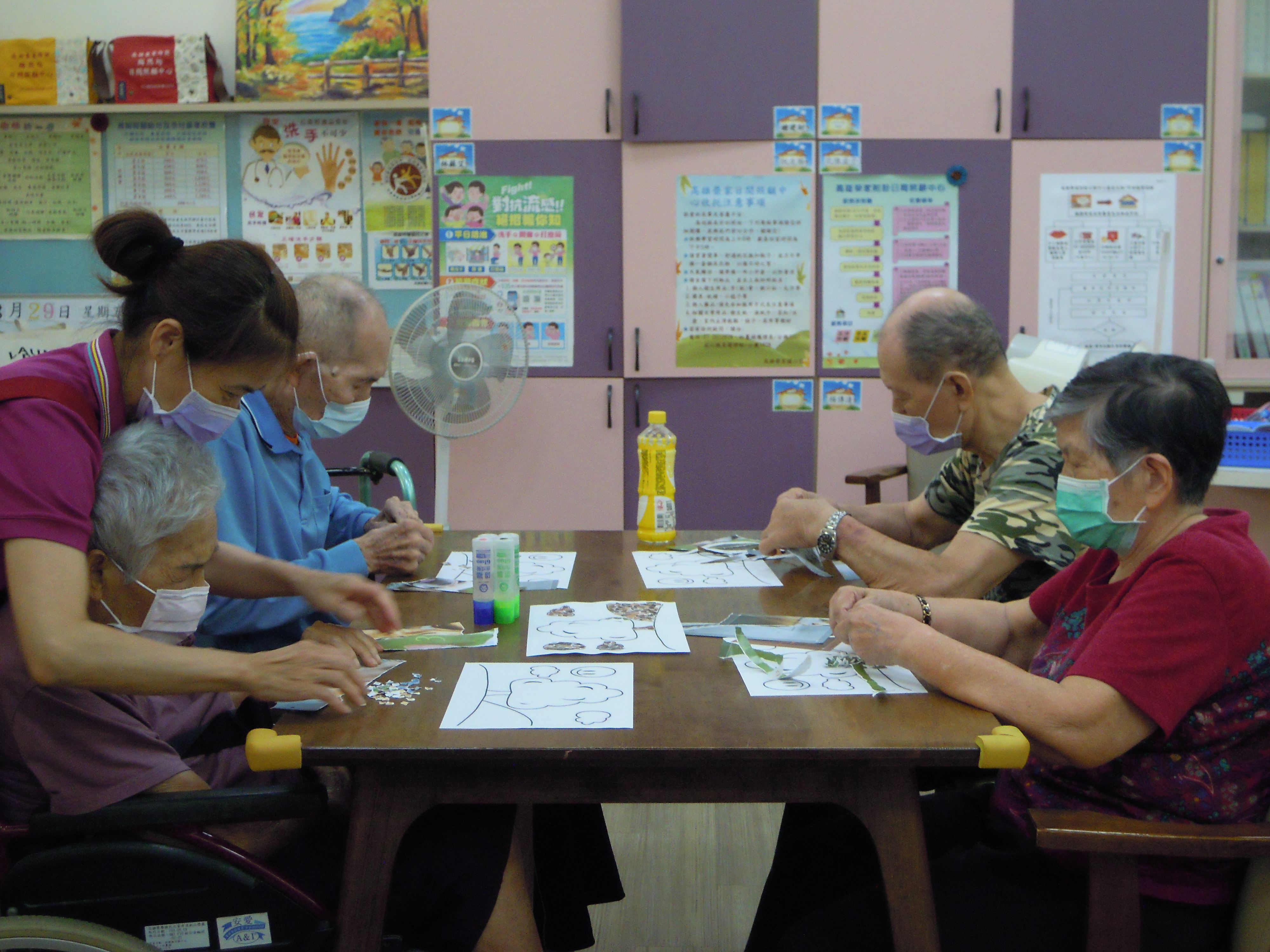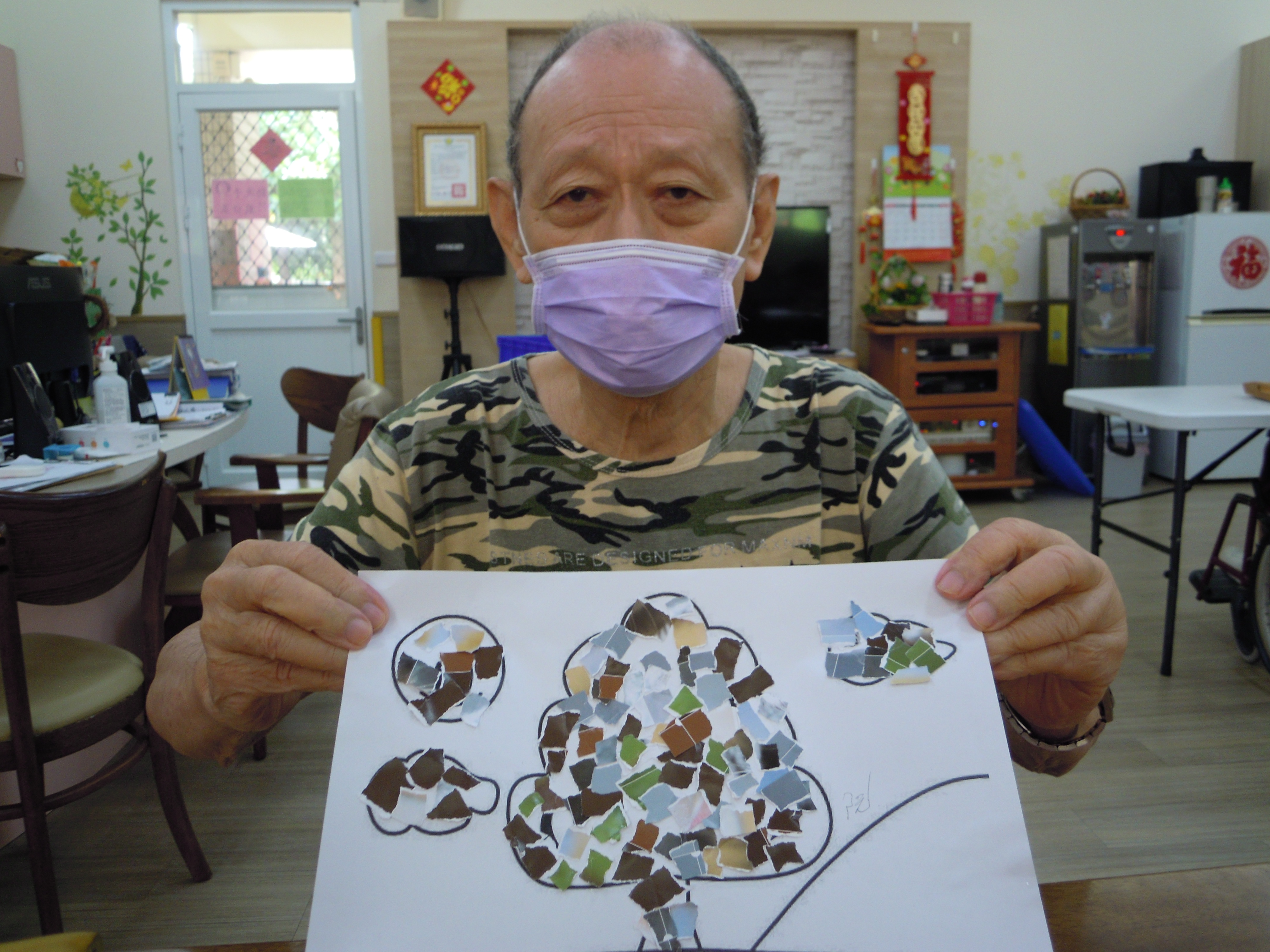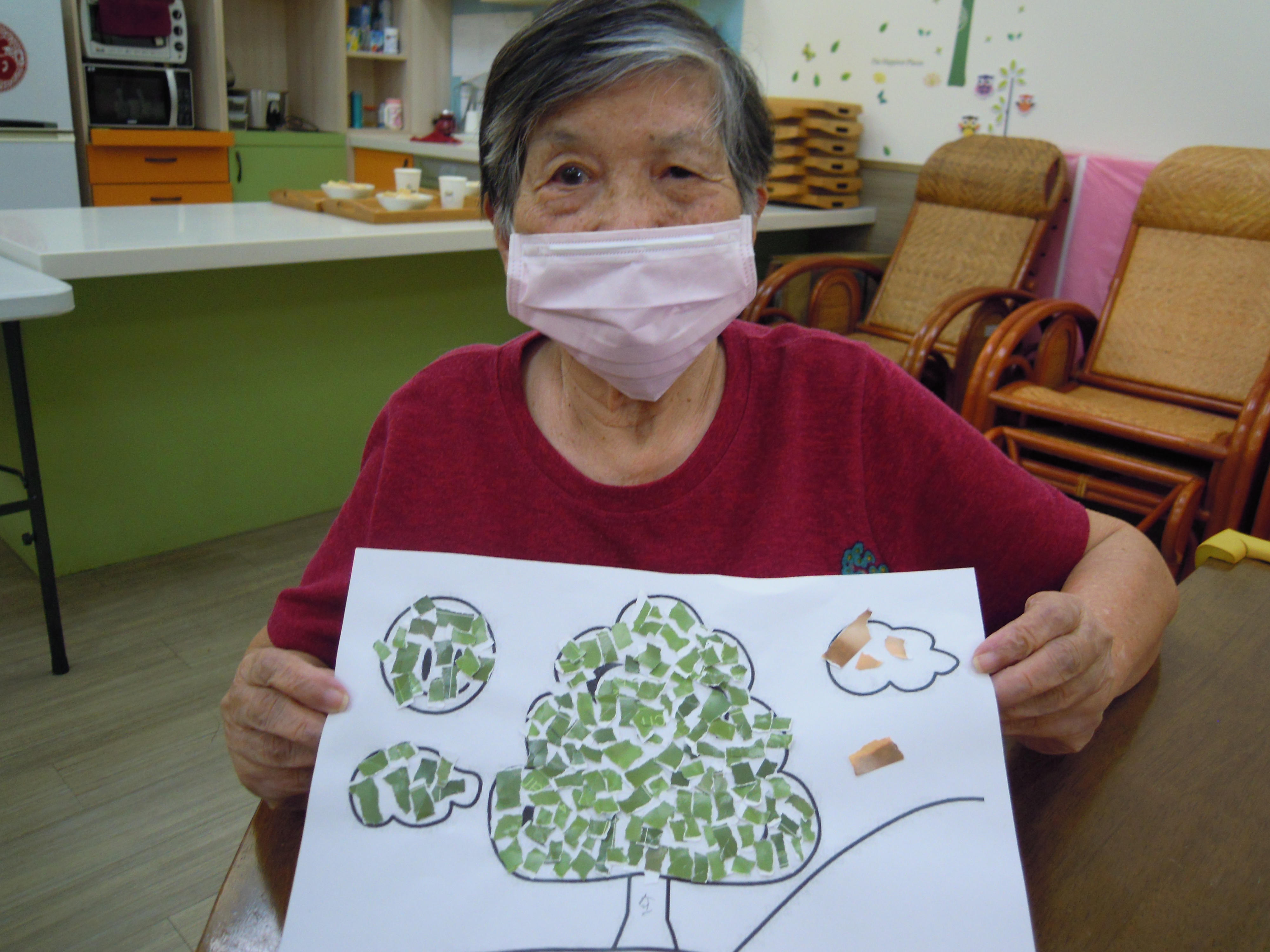 日照的撕貼畫,是讓長輩把廣告紙用手撕得碎碎的,再黏貼到另一張紙上,不但可以訓練手指靈活性和協調性,還可以訓練長輩的耐心度和細心度以及對於顏色搭配的美感,就讓我們來看看長輩們的巧手創意吧!