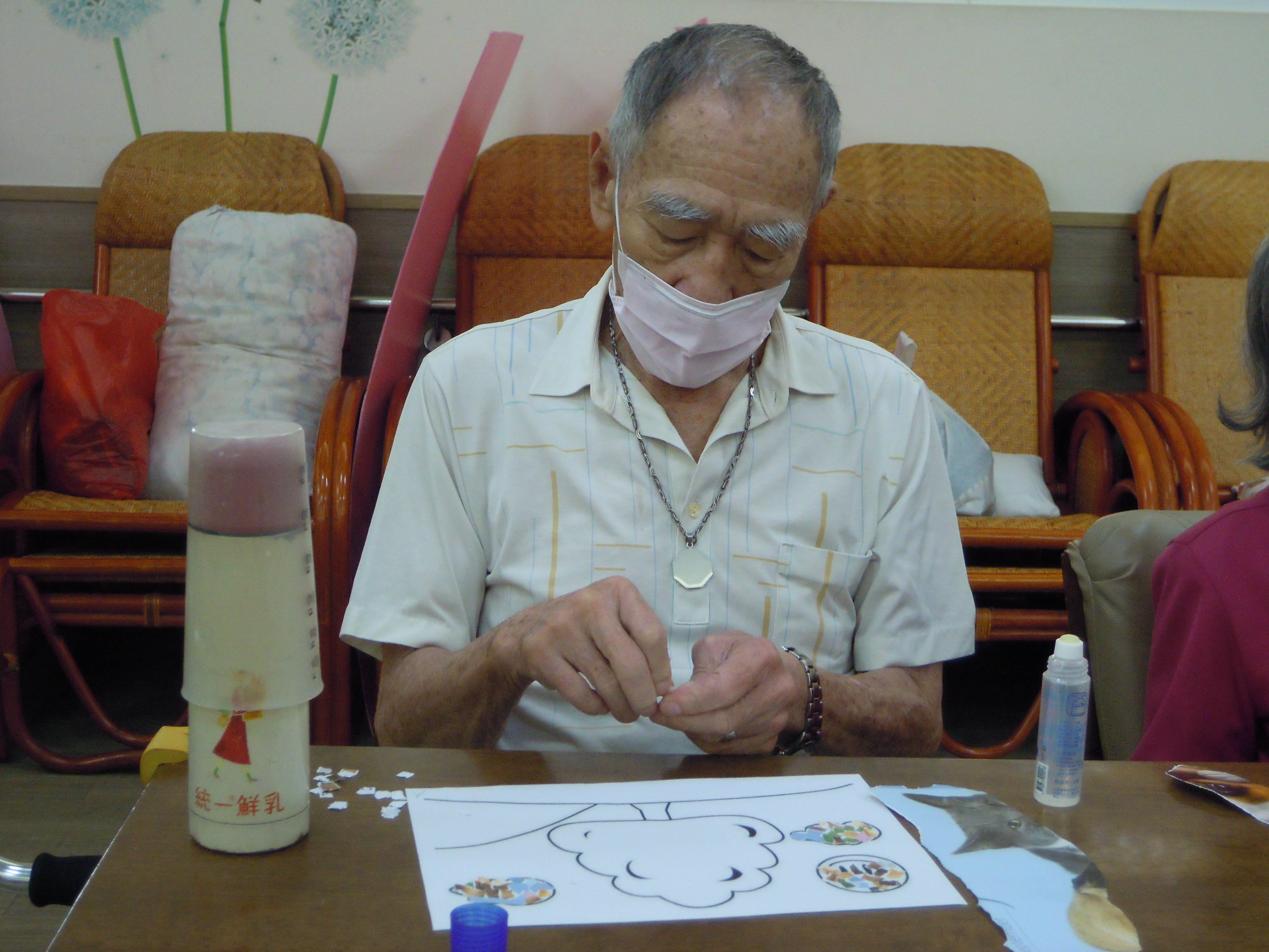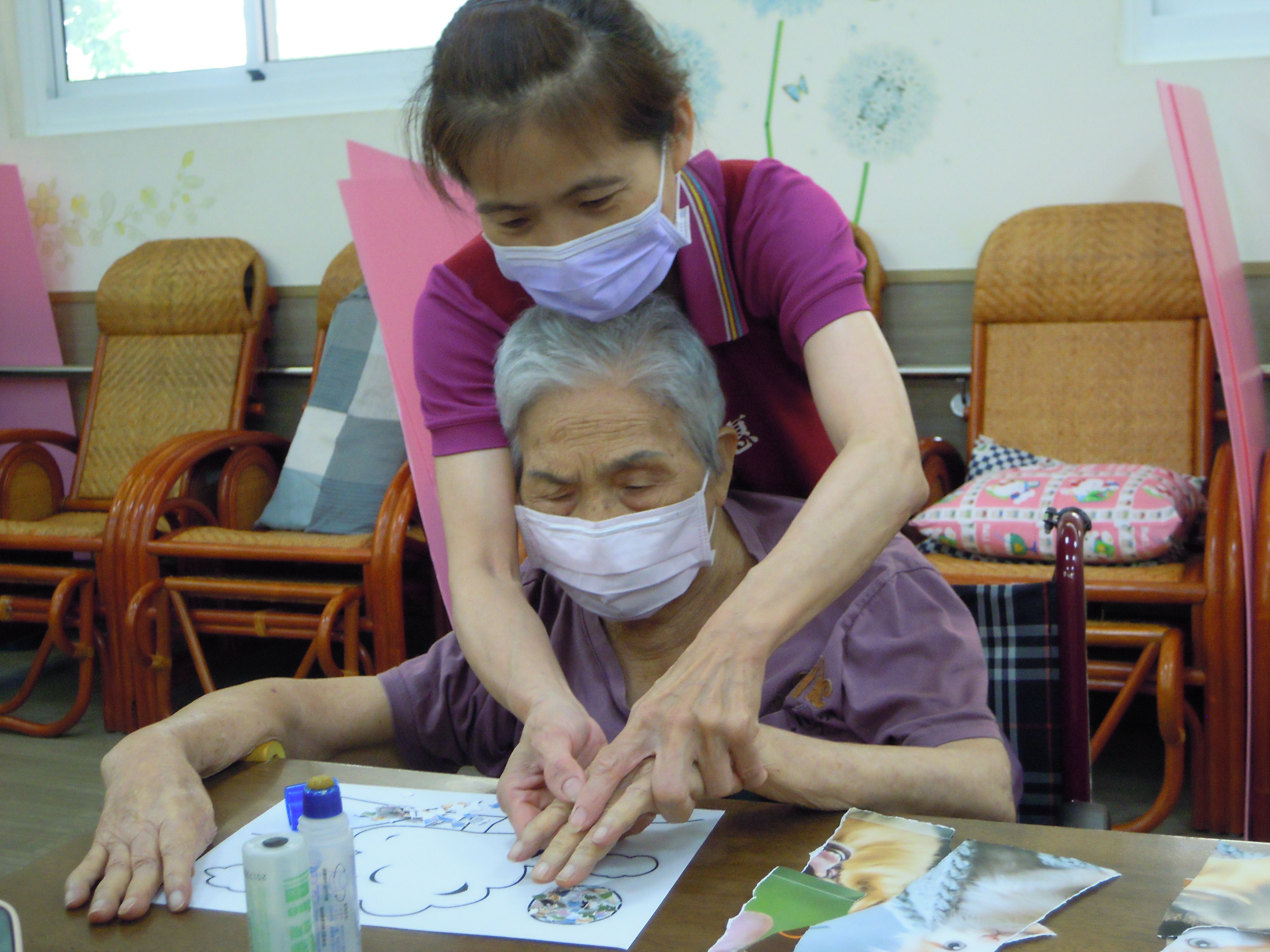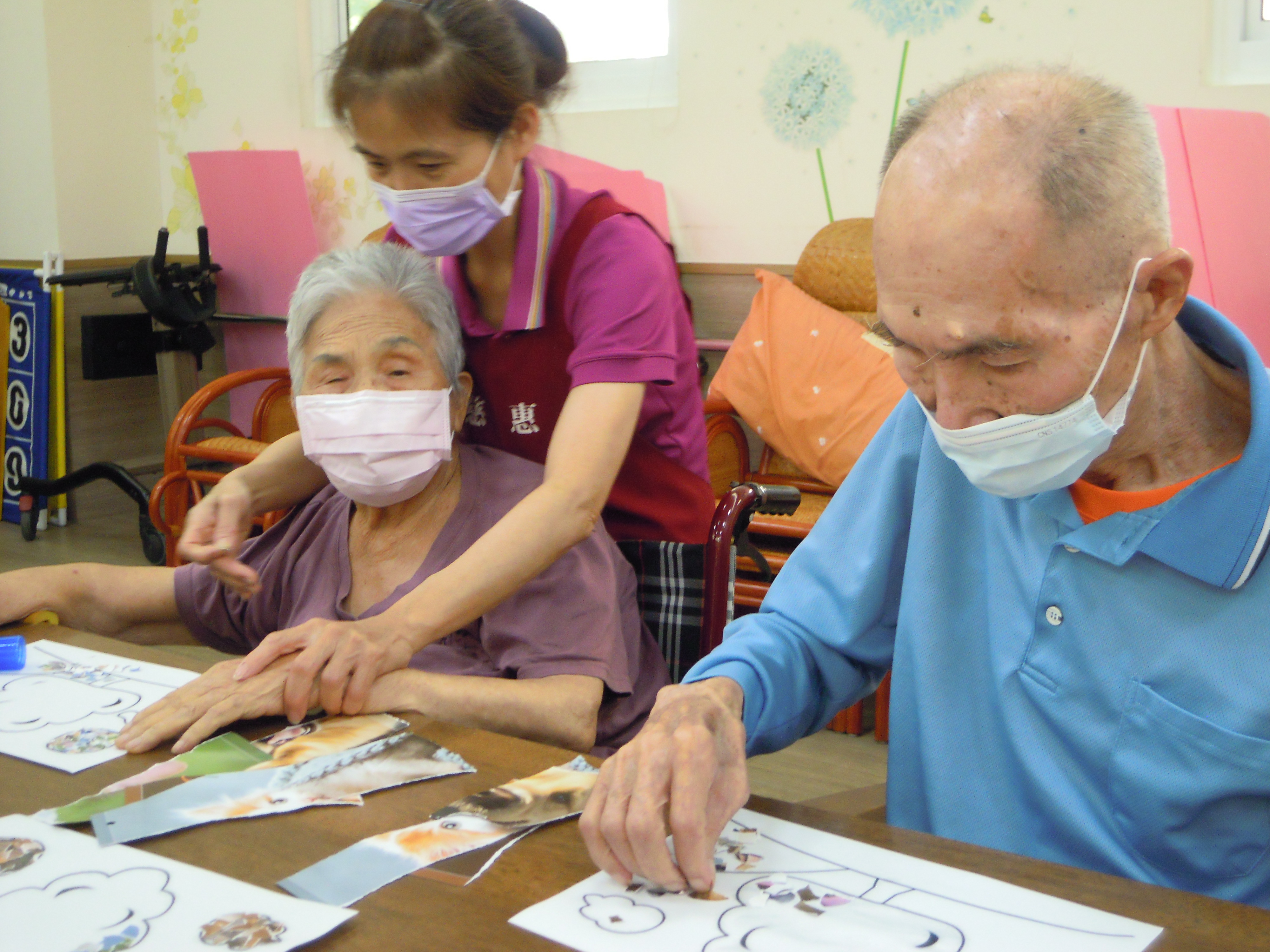 日照的撕貼畫,是讓長輩把廣告紙用手撕得碎碎的,再黏貼到另一張紙上,不但可以訓練手指靈活性和協調性,還可以訓練長輩的耐心度和細心度以及對於顏色搭配的美感,就讓我們來看看長輩們的巧手創意吧!