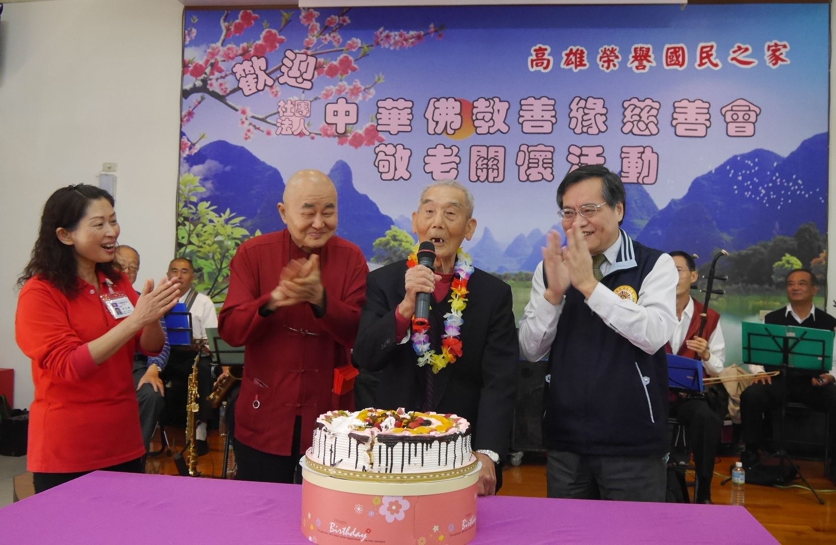 高雄榮家為了讓三月份生日的壽星長輩們有個難忘的慶生回憶,特別邀約「社團法人中華佛教善緣慈善會」及「愛心樂團」擴大辦理慶生茶會,給予長輩們特別的祝福。 壽星長輩們滿心期待,一大早就擠滿活動會場,每個壽星長輩都特別披戴代表尊榮的彩色花環。首先由高齡98歲的壽星代表楊○清伯伯上台接受大家的祝賀,楊伯伯感性的祝福在場所有壽星們生日快樂、萬事如意。林火土家主任除了祝福所有高雄榮家的壽星長輩們歡喜呷百二外,也感謝向來熱心公益不遺餘力,愛心善行不勝枚舉的中華佛教善緣慈善會張騰龍會長及理監事們,特別前來與本家壽星結緣,頒發生日禮金,更捐贈3萬元加菜金幫長輩補充營養。 榮民長輩們就在歡樂的氣氛中歡慶生日誕辰,而長輩們期盼的娛興節目,在愛心樂團的最佳主唱李主任溫柔婉約的甜蜜蜜歌聲中,將長輩們帶回懷舊時光,立即獲得壽星長輩們如雷掌聲。接著由壽星廖○福伯伯與照服員合唱「雪中紅」,在現場樂隊的伴奏下,伯伯們可是台風穩健、歌聲嘹亮。而董○之伯伯演唱「濛濛春雨」,更是讓在場所有長輩們安可連連;馮○桂伯伯氣宏如鐘的演唱「家在山那邊」,中氣十足,歌聲透露對家鄉的思念,真是令人動容。而最令人拍案叫絕的是高齡86歲的壽星范伯伯表演扯鈴絕活,單耳扯鈴、扯鍋蓋、都輕而易舉,竟然連小茶壺蓋都可以扯動,讓所有觀眾們驚呼連連,掌聲不斷。 活動最後家主任與在場所有的嘉賓及壽星長輩們合唱一首「感恩的心」,感恩佛教善緣慈善會的善心義行、感謝榮家團隊對所有長輩們的照顧、亦感謝所有長輩的熱情參與,讓今天的慶生茶會畫下了圓滿的句點。