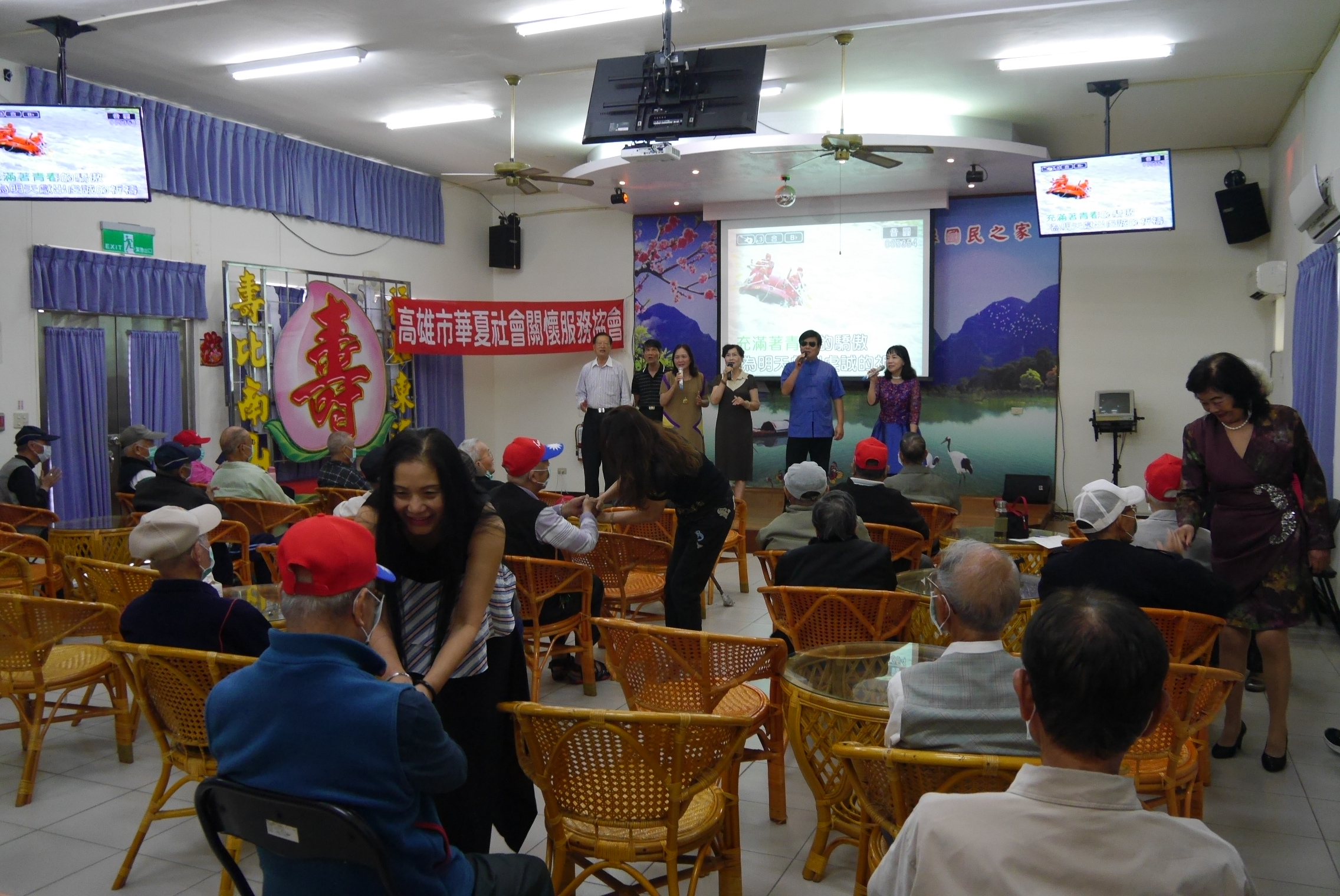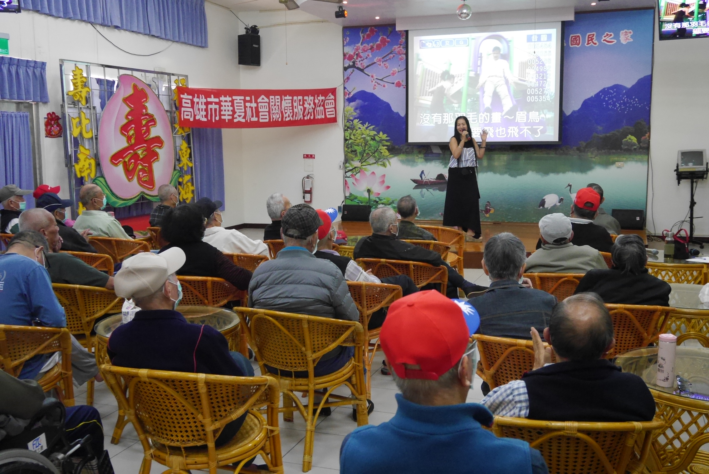高雄市華夏社會關懷服務協會由鄒新蓮老師領軍再次蒞臨高雄榮家辦理熱鬧溫馨的音樂饗宴,長輩們也早早的來到會場滿心期待聆聽精彩的歌曲演出。 活動開場首先由鄒新蓮老師獻唱一首《桃花江》揭開序幕,柔美的音色讓長輩們聽得如癡如醉,陶醉在美聲中。緊接著,由協會團員們依序上台獻唱一連串動聽的歌曲《郊道》、《甜蜜蜜》、《蘇州河邊》、《沒有泥土哪有花》、《千言萬語》、《我只在乎你》、《悲歡歲月》等等曲目,無論是懷念老歌金曲、小調或民歌,每一首都是由表演老師精心挑選長輩耳熟能詳的著名金曲。一首首膾炙人口的歌曲在老師們完美詮釋下,勾起了長輩們回憶,沈浸在優美的旋律中,忍不住跟著哼哼唱唱;當表演老師演唱《我是一隻畫眉鳥》曲目時,輕快的曲風更讓長輩們不住的搖擺身體。 節目在所有團員們一齊合唱《明天會更好》的歌聲中進入尾聲,在動人的歌曲旋律中,主持人將滿滿的祝福送給長輩,期盼長輩們都能平安喜樂、身心安康,並相約下次相會,共享幸福的歡樂時光。