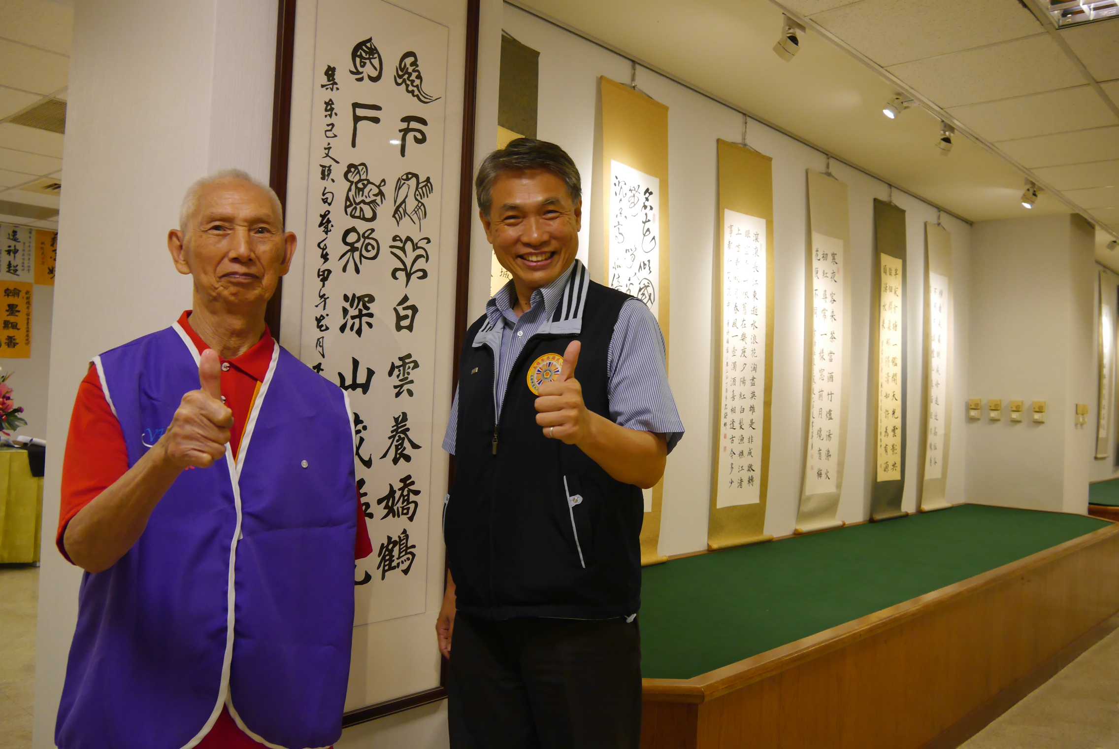高雄榮家書法社團是本家最有文藝氣息的社團,家主任常參與本家書法社的作品發表,平日也會與社團長輩們一起揮毫同樂,尤其是每月壽星都會收到家主任親筆書寫的福壽字賀帖,讓長輩開心不己。這次高雄市小港關懷老人協會書法聯展,本家書法社前後任社長于伯伯及劉伯伯的作品獲選參展,王繼開主任特地陪同書法社長輩們一起前往高雄市社教館觀賞,長輩們非常開心參與其他社團交流! 館中陳展許多精采的書法作品,不論是篆書、行書還是草書,深感字裡行間行雲流水,神韻俊逸;長輩們非常認真仔細的討論觀摩,佇足在作品前研析許久,又看到榮家長輩作品陳展在社教館,真是讓人感動和驕傲!這次的觀展領略了書法多元發展的生命力,就如程伯伯說的「字如其人」,書法美化環境,也陶冶心靈,更凝聚書法社長輩們的情感,真是一次美好的文化體驗! 高雄市小港關懷老人協會黃壽全理事長表示,本家于伯伯的書法墨字可是在書法界中經常獲獎,所以對于伯伯印象非常深刻,原來高雄榮家長輩個個都是臥虎藏龍,深藏不露啊!在大家依依不捨離開前,王繼開家主任再次感謝黃理事長,並邀請今年過年前夕一起到榮家聚賢揮毫春聯,品茗作品!
