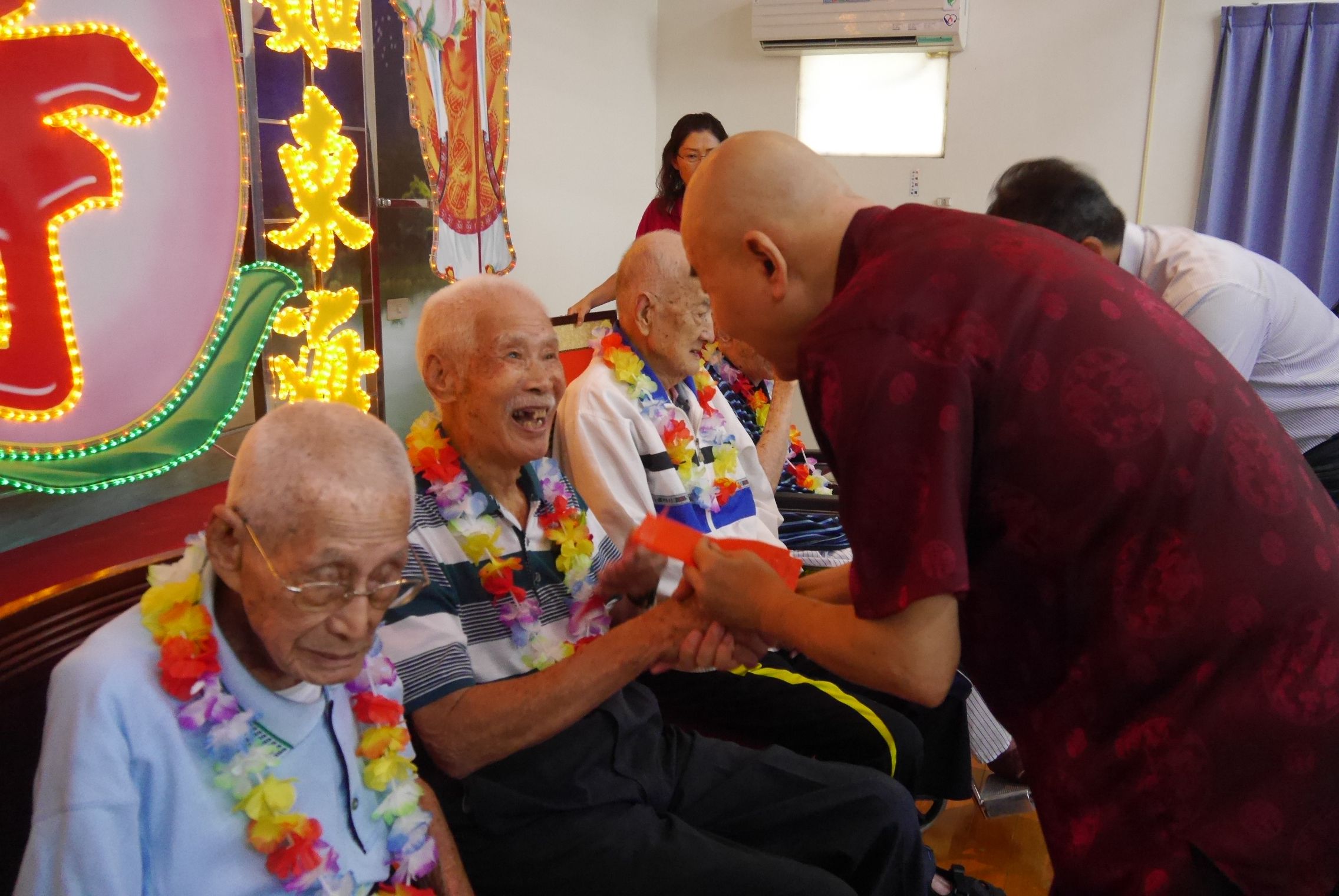 本月份高雄榮家又增添一位百歲人瑞,特別在8月29日為百歲人瑞榮民俞銀祿爺爺及八月份壽星擴大舉辦慶生茶會,讓壽星長輩們有個難忘的美好回憶。 百歲人瑞俞銀祿爺爺生於民國9年,浙江東陽縣人,民國63年上士退役,於民國90年7月入住本家,曾於民國98年莫拉克風災捐款貳拾萬元,愛心善舉,足堪表率。平日作息規律注重細節,樂觀開朗,與住民及工作人員相處融洽,因為注重運動及養生,身體相當健朗,讓人猜不出是百歲長者。尤其經常踴躍參與榮家各項文康活動,喜歡飯後在美麗的家區散步。 慶生活動中,高雄榮家王繼開家主任特別代表蔡英文總統及行政院蘇貞昌院長致贈祝賀壽屏,也親自替俞爺爺戴上輔導會致贈紀念金戒子。家主任更貼心親筆揮毫寫下壽字賀帖,祝賀「遐齡永樂、壽比松齡」,並請俞爺爺許願切蛋糕,更特別地是邀請本家五位百歲人瑞一同上台歡慶,頓時間台上份量十足,真是「百歲、千歲、萬萬歲!」本次特別邀請中華佛教善緣慈惠會張騰龍會長及中華民國雜誌事業協會許睿閎理事一起到榮家共襄盛舉,張會長敬贈祝壽禮金並恭祝百歲人瑞長輩們「壽比南山、健康呷佰二」。 慶生會也邀請育正幼兒園的師生來榮家表演活潑動感的「慶豐年」,只見小朋友敲鑼打鼓唱唱跳跳,讓所有在場的長輩們開心無比,炒熱了現場氣氛;而高齡93歲的王伯伯也感性地上台表示:「在這些老大哥面前,我只算是小老弟啊!看到榮家為了百歲壽辰人瑞,這麼精心、用心的安排活動,覺得非常感動,也希望高雄榮家不僅僅是高齡友善榮家,更是百歲人瑞榮家。」 茶會活動中,長輩們忍不住一首又一首的上台高歌,在溫馨又熱鬧的氣氛中歡慶生日壽誕。王主任表示,榮民一生奉獻國家,我們以榮民為榮,也會竭盡所能照顧和服務榮民,榮家的住民長輩都是我們最重視的家人,期盼長輩們在高雄榮家都能安居樂活、頤養天年!