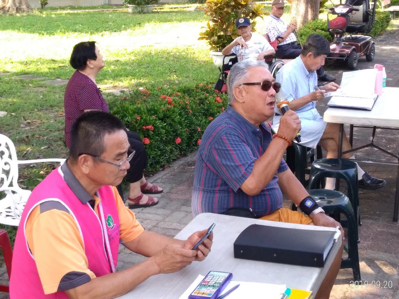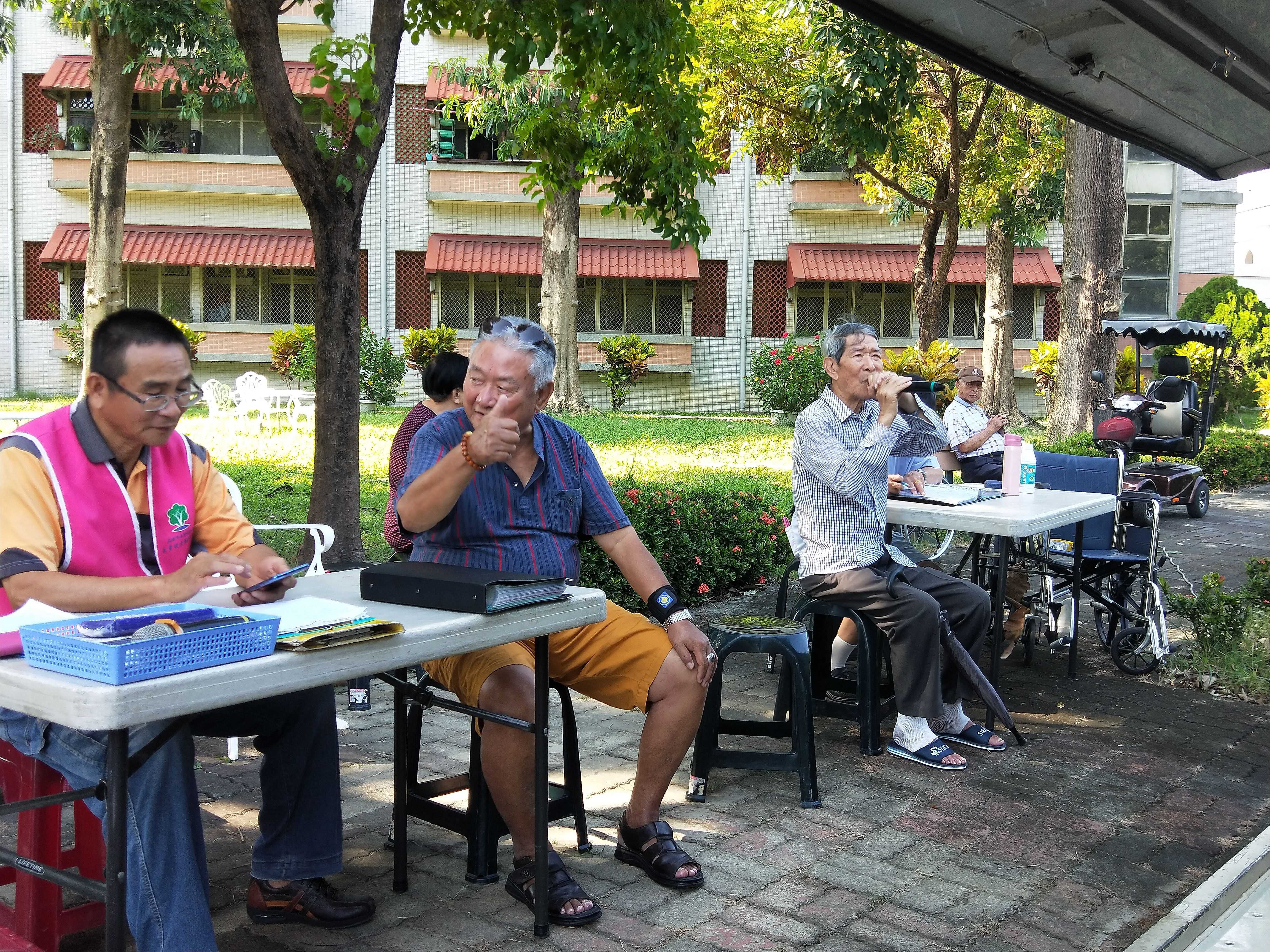 因遇颱風與下雨季節,社會局長青中心文康車近2個月無法來榮家,難得今天天氣晴朗,戶外吹著徐徐的微風,當長青中心文康車準時到達本家槌球場旁空地,喜愛歡唱的住民長輩早已等候多時,自備茶水,準備高歌一曲,文康車司機大哥貼心的準備餅乾與長輩們一起同樂,歡度一展歌喉的美好午後時光。 活動開場由詹勳佳伯伯一首《弄獅》的熱鬧歌曲開啟序幕,接著杜守貴伯伯《美酒加咖啡》,讓在場的長輩聽得忍不住叫好,王敏吉伯伯也唱著《吻和淚》,美妙的歌聲讓人如痴如醉,長輩們除了拿出自備的歌曲清單外,也陸陸續續上前翻閱歌本點歌,演唱《一縷相恩情》、《春風吻上我的臉》、《春花秋雨》、《煙花三月》、《海底針》…等等一首首動聽的經典歌曲;每一位歡唱的伯伯阿姨們都是最好的歌手、最棒聽眾,長輩們以歌會友、相互加油打氣,在長輩明星們完美的詮釋下,樂音飄揚到榮家的每個角落;現場氣氛熱鬧又溫馨。 長輩切磋歌唱技巧,唱出自己的拿手曲目,相互鼓掌喝采,增進了彼此的情感與默契,在優美的家區歌唱,每個人都開心的露出歡樂的笑臉。一個月一次的長青戶外卡拉ok,讓大家都捨不得離開,欲罷不能,希望每回來時都能是好天氣,文康車司機大哥也答應大家下個月一定會再來家區舉辦戶外歡唱活動,陪伴大家開心度過美好的下午時光。
