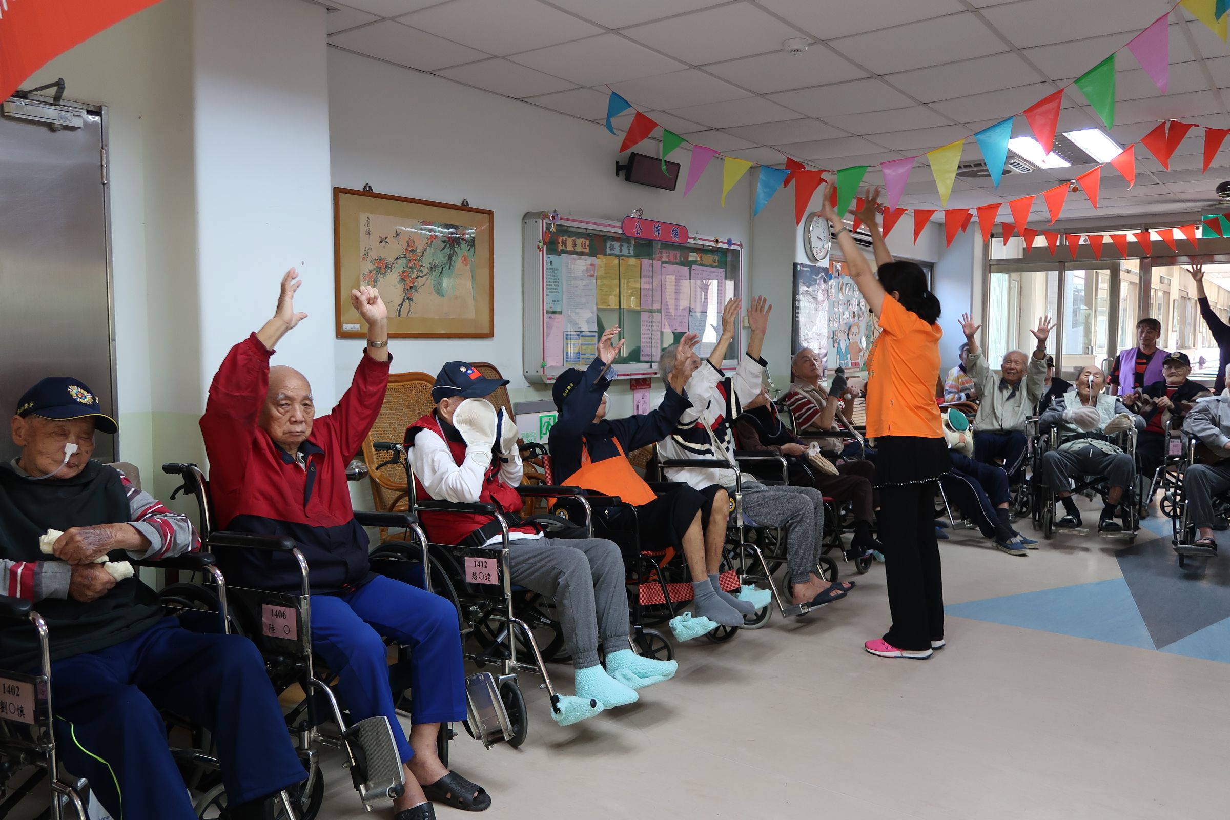 為了讓養護專區住民長輩也能有不同以往的團體活動,高雄榮家日前結合「高雄市善老師生命關懷協會」,引導行動不便的住民長輩一起動動身體做健康操,為平日生活注入一股熱情動力! 高雄市善老師生命關懷協會長期關懷弱勢族群,以珍惜生命、關懷生命、教育生命之價值為宗旨,四處為行動不便的長輩辦理敬老活動已有7~8年之久,希望帶給這些長輩不同的生活體驗,透過動一動、增進肢體肌力。 「來!各位劉德華帥哥、蕭薔美女,注意囉!舉起手,跟我一起打拍子」、「不錯唷!就是這樣,再做三下!」,養護專區的長輩們在熱情的老師帶動下,也舉起平時很少伸展的雙手跟著音樂打起拍子,在老師一對一熱情鼓勵抬腿運動時,只見坐輪椅的宋伯伯、姚伯伯也努力的試著抬起腳來,讓所有在場的工作人員為他們鼓掌加油!在老師有趣的互動問答,讓平常很少說話的安伯伯,也笑著開口回應「好唷!」,真是讓工作人員感動不已;活動過程中,還辦理「帥哥隊」、「小鮮肉隊」舉手競賽,長輩們輸人不輸陣的努力舉起手,就希望自己的隊伍舉手人數最多,也間接地引發長輩們自然的伸展筋骨。 在活潑熱鬧的氣氛中,養護專區透過這一小時的健康操活動,現場的長輩嘴角笑容變多,身體熱了起來,感覺時間一下子就過去了,有些長輩還舉起姆指按讚來表達對老師們的感謝!整個活動熱鬧又輕鬆,也動出了健康活力。 高雄市善老師生命關懷協會老師們表示~坐輪椅、行動不便的長輩互動反饋雖然較少,要花氣力多引導,我們仍會努力互動,因為長輩們若能在這一小時的健康操中,每抬一次腿,拍一次手,舉起伸展,對我們而言就是成功,對長輩來說就是進步,每次進步一點就可延緩老化!」。 活動結束時大家充滿能量開心的合影,看到養護專區長輩們臉上不同以往的神采奕奕!希望老師們能夠定期蒞臨高雄榮家,為養護專區的長輩們量身定作活力操,帶來健康促進與活力! 相關照片