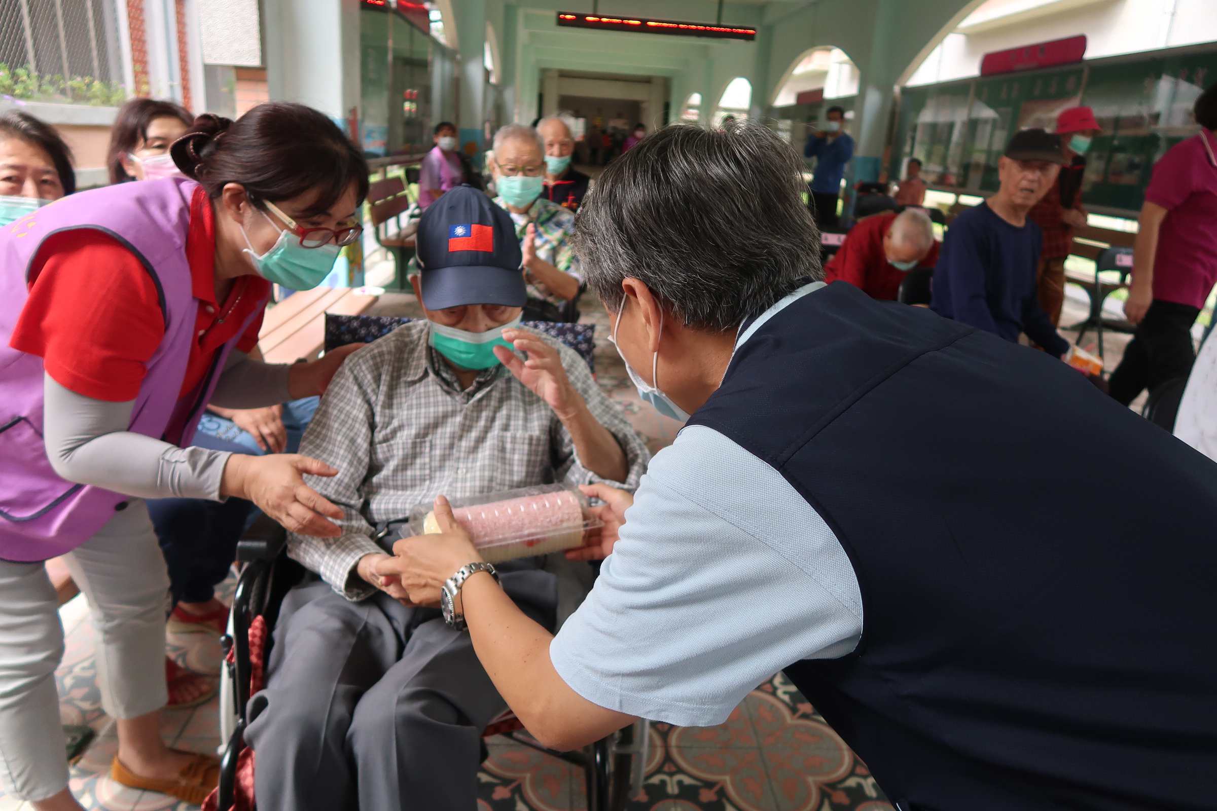 王繼開主任特別邀請住民于宣琛伯伯來到會場,于伯伯深以榮民為榮、以榮家為家,今年初捐贈榮家20萬元,讓高雄榮家在新冠肺炎的防疫作為上能夠超前部署,第一個完成獨立隔離房的建置。因此特別在本月慶生會場致贈有輔導會會徽的「銅製文鎮」。王主任表示如同文鎮上篆刻「照顧榮民 敬愛袍澤」的八個字,于伯伯愛護袍澤的精神表露無遺,所謂寶劍贈英雄,致贈文鎮讓擅長書法的于伯伯每天練字很實用。最後王主任也祝福所有壽星長輩福如東海、壽比南山,平安健康!