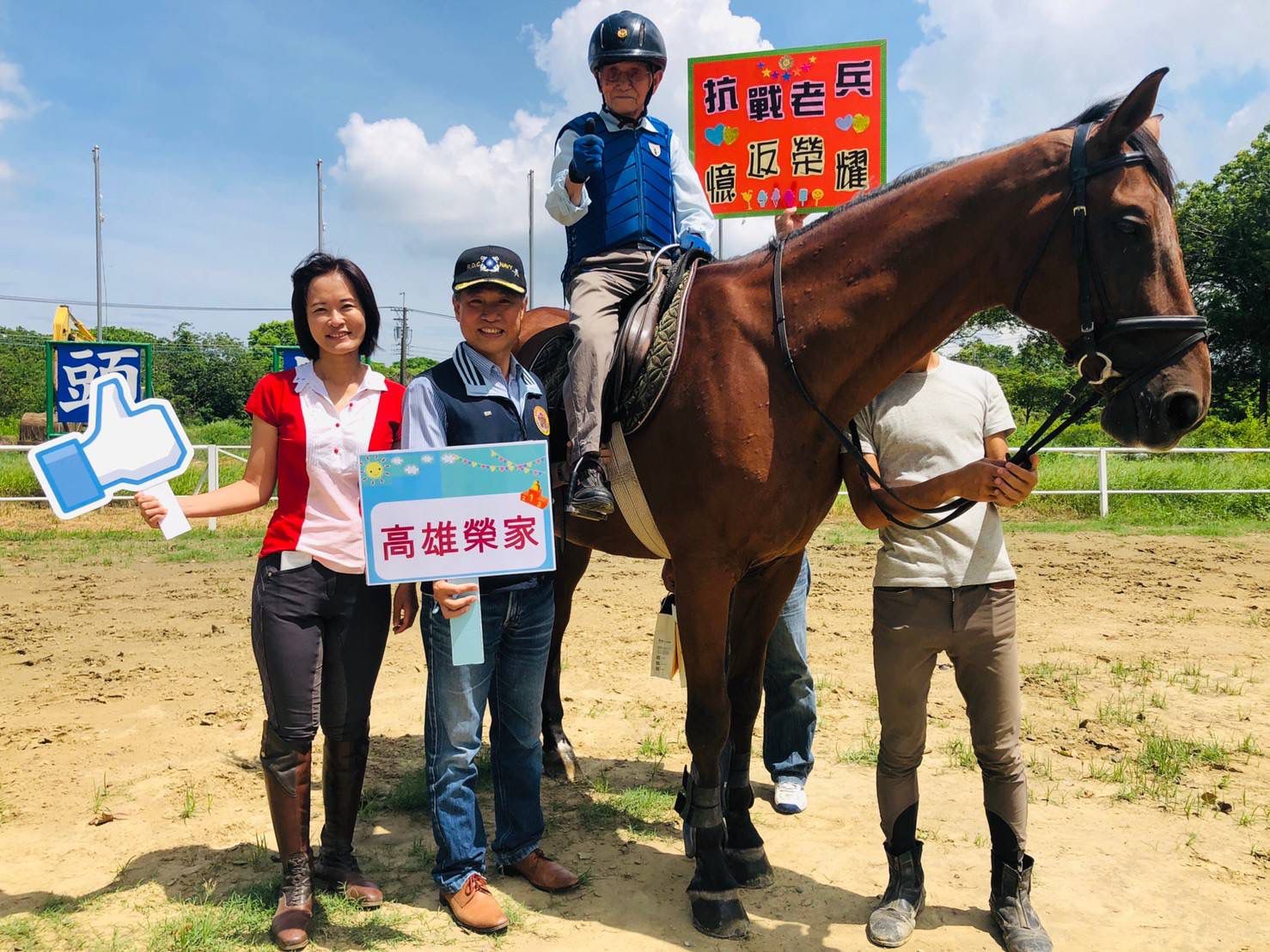 高雄榮家為表達對參與七七抗戰英雄的尊崇,特別規劃辦理不同以往的紀念活動。7月3日由王繼開主任親自陪同抗戰老兵榮民代表高鳳貴伯伯前往橋頭馬術中心,進行77抗戰紀念活動場勘。平日保持跑步習慣的高伯伯高齡96歲仍身體硬朗,以擔任此次活動先鋒,進行騎馬體驗而深感榮耀。伯伯一路上談及過往參與抗戰的點點滴滴,當時因受家庭薰陶、深具民族意識與愛國情操,在當時號召十萬青年十萬軍之際,毅然投筆從戎,伯伯笑說當時槍桿子都快比他高呢! 面對這位抗戰老兵英雄,橋頭馬術中心的董事長李宜珍女士親自全程接待,先參觀富有巴洛克特色的八角門馬廄及馬匹,然後挑選第一高大的褐色駿馬讓高伯伯體驗。只見伯伯身穿馬術背心、頭盔、手套及馬鞭,在騎師協助下踩穩登梯轉身就順利跨騎馬背,讓眾人驚呼看不出是96歲高齡了。高伯伯在李董事長兒子Simon身為馬術國手的護衛下騎著駿馬Neno,圍繞在馬場的藍天白雲草原間,讓伯伯回憶起那段騎戰馬、揮大刀的戰場歲月,高伯伯興奮又感性地說:雖然一生歷經國難顛沛辛苦,現能平安的安享晚年,真要感謝國家對老榮民的關懷照顧;臨別時也連聲感謝李董事長的慈善愛心及愛憐稱讚馬兒Neno。 高雄榮家為使今年抗戰紀念日有多樣化的團康活動,特別積極規劃與橋頭馬場中心合作,將在7月7日共同安排帶領榮家14位抗戰老兵英雄來馬術中心體驗參觀,讓長輩們藉由與駿馬的親密互動、回憶抗戰的榮耀,進而表達對榮民老兵英雄的崇高敬意!