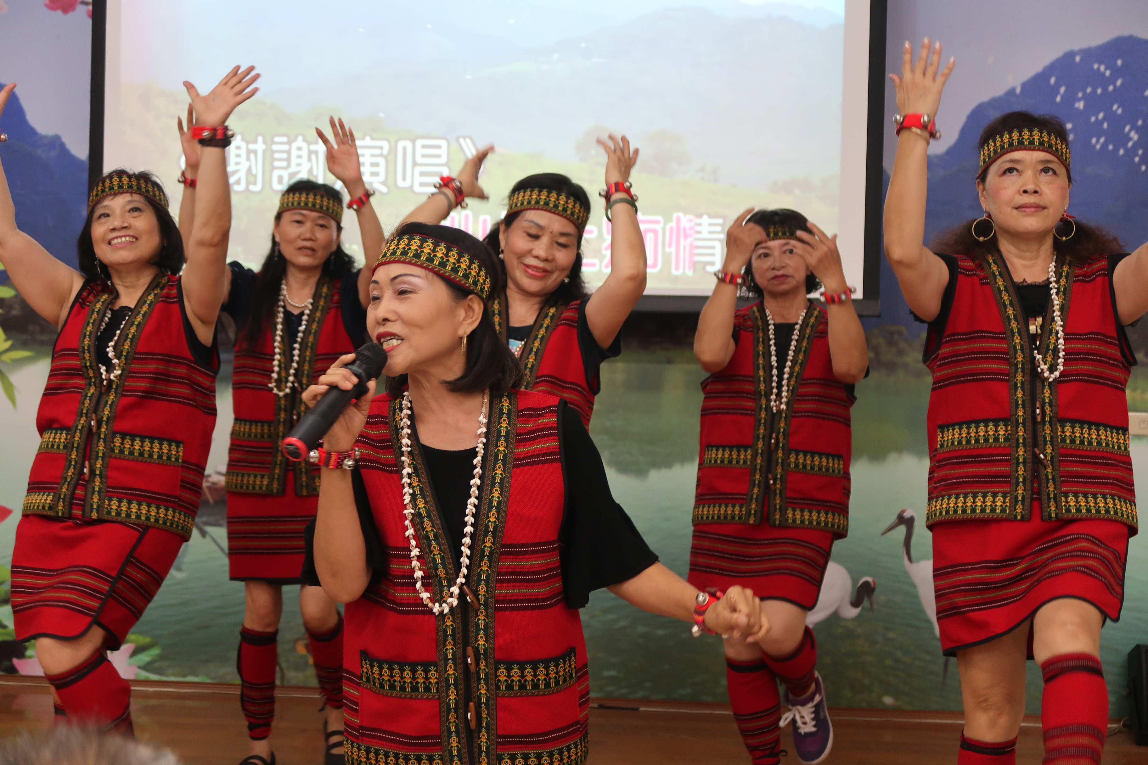7月13日樂透歌友會劉清田會長帶領9位美女歌手,再次把裝滿歡笑的樂透列車開進高雄榮家,舉辦一場山地情歌演唱會,老師們用最熱情的舞蹈及歌聲,讓現場高潮一波又一波,歡笑不間斷! 今天表演主題為山地情歌,劉清田會長及眾美女以原住民服飾吸引伯伯阿姨們的目光,合唱一首《我們都是一家人》為演唱會熱情揭開序幕;緊接著由溫柔的莉莉老師演唱〈馬蘭情歌〉帶出機智問答:詢問長輩這是哪一個原住民族的名曲?坐在最後排高齡88歲錢伯伯舉高手搶答”阿美族”,獲得掌聲與獎品,錢伯伯信心大增,馬上換坐到最前排,一路搶答,笑得合不攏嘴! 老師們輪流上台演唱《一把情種》《再會吧心上人》《梨山痴情花》《娜奴娃情歌》、《烏來山地一梨花》《碧蘭村的姑娘》等,劉清田會長穿插介紹有名的”周藍萍”詞曲名家,隨即提問伯伯們平時經常唱的歌曲裡,有哪一首也是周老師的作品?只見後排坐輪椅的劉伯伯也不落人後立刻舉手搶答”綠島小夜曲” ,獲得熱烈掌聲,也讓演唱老師們大讚高雄榮家長輩們真是臥虎藏龍啊! 劉清田會長再次讓長輩們挑戰拚字遊戲,伯伯們有了前次經驗,很快抓到字串排列訣竅,把相同字兩兩排列,挑出落單的字卡,比前次更快速準確的完成任務,也讓老師們見識到榮民長輩的機智,幫榮家伯伯們按個大大的讚。 身材高挑的德馨老師演唱一首《站在高崗上》為活動譜上句號,高吭又激昂的歌聲,讓長輩們鼓掌叫好,現場安可聲不斷;劉清田會長帶著老師們加碼獻唱《採檳榔》、《姑娘十八一朵花》,活動在一片歡樂聲中結束,彼此相約八月再見! 相關照片