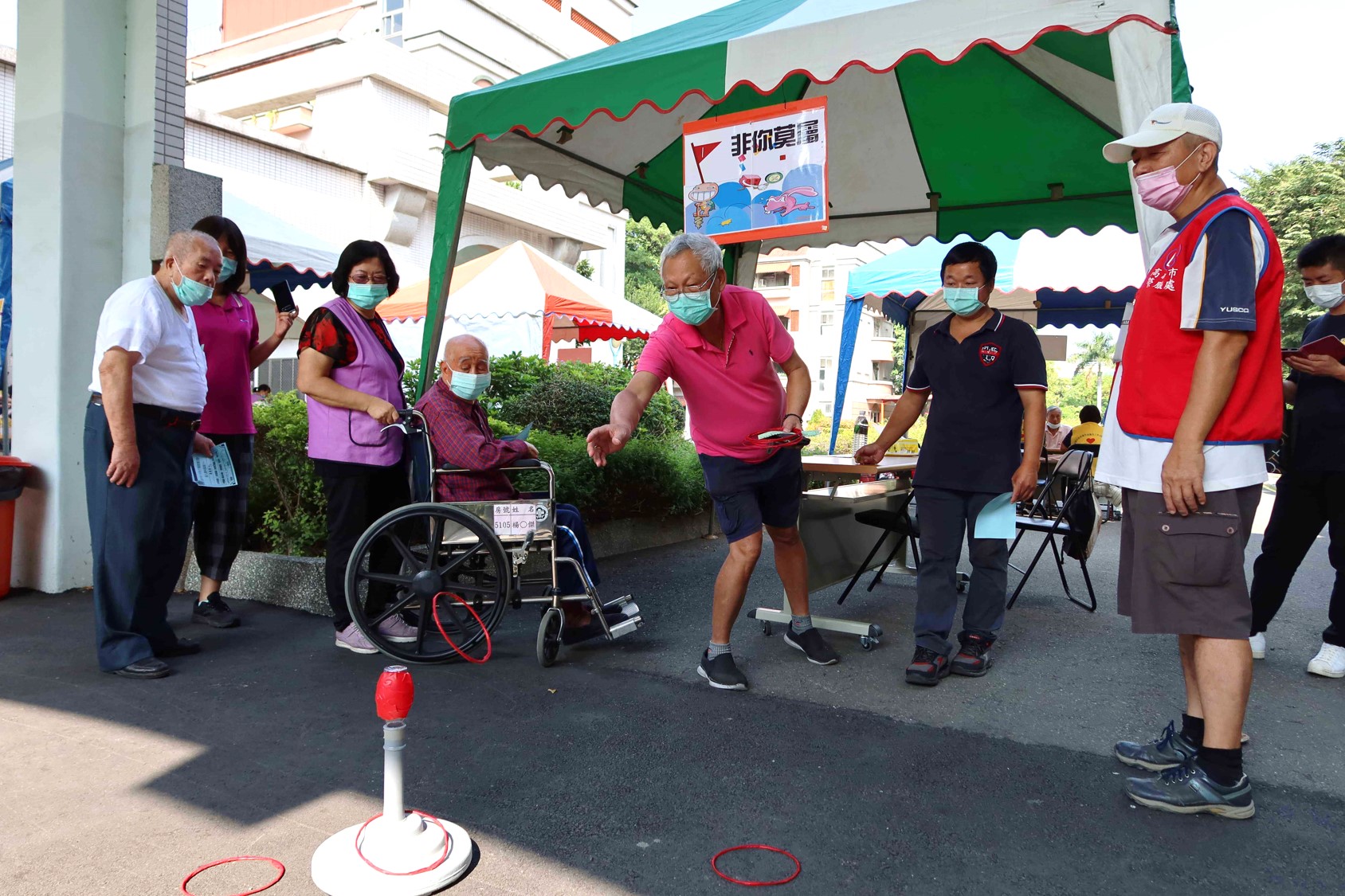 「個人趣味闖關區」及相關單位宣導攤更是熱鬧滾滾,每個攤位擠滿了排隊長輩。闖關活動有「飲食紅綠燈-營養大考驗)」、「非你莫屬-套圈圈」、「桌上冰壺-滑進靶心」、「小李飛鏢-射氣球」,長輩們手持闖關卡,一關闖過一關。94歲鄧伯伯玩得好開心,笑哈哈說今天活動真是有趣好玩!坐輪椅長輩們也不落人後的闖關拿獎品,現場歡笑聲不斷。長輩們闖關完成,開心兌換餐盒及小獎品。閉幕式時,王主任還摸出5位幸運兒頒贈紀念品,宏榮里據點高中3位幸運長輩,真是好福氣的厝邊,也是榮家與社區共融的最佳寫照,長輩們玩得好開心,活動圓滿成功。