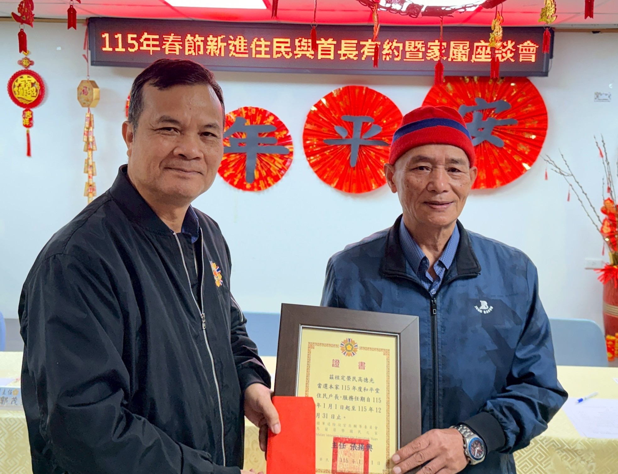 馬蘭榮家於本(2)日上午9時於住民活動中心召開115年「春節新進住民與首長有約暨眷屬座談會」,會前頒發榮民房、戶長春節慰問金,以及踴躍參加文康活動人員獎項,張揚興家主任特別感謝各堂房(戶)長,平日協助榮家做好與住民溝通協調工作,受獎者均能感受到榮家關懷照顧的用心。 座談會由張家主任主持,組室主管及堂隊長等服務幹部列席,參與座談會人員包括房長、戶長(榮民幹部)、新進住民、眷屬等多人參加座談會,大夥齊聚一堂,以座談會方式提供建言及意見交流,經由座談會發言,列席服務幹部更能深入體會住民、眷屬對於榮家生活照顧的期許與需求,比如生活設施的增設與改善,以作為日後服務照顧改善與策進努力方向。 家主任在會議中特別提醒各級幹部在春節連假期間,各堂隊每日應落實人員掌握,堂隊幹部職員工更應具體對於新進住民及年老體弱或心情起伏不定者,加強關懷訪視及於春節連假期間辦理各項文康活動,抒解住民思鄉情緒,讓住民在佳節感受更多溫暖關懷。 家主任也特別期勉在場服務幹部要秉持精益求精、便捷服務流程、優先處理住民生活設施之服務理念,懇切為所有住民服務,也勉勵住民長者,入住榮家,有任何生活照顧意見及建議,均可隨時反應,榮家服務團隊也會盡心處理住民各項反映意見。最後,提前向大家恭賀新年快樂、春節吉祥安康,馬蘭健康快樂園區平安快樂,座談會在溫馨祥和氣氛下圓滿完成。
