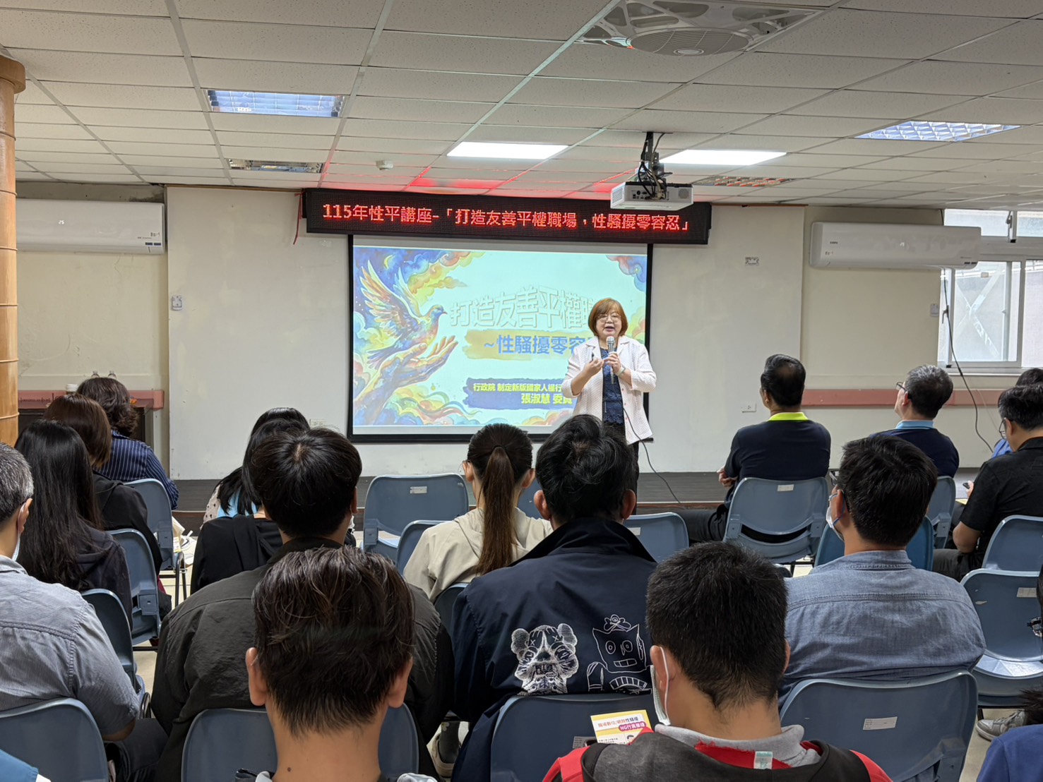 本次講座以推動職場性別平權與強化性騷擾防治觀念為核心,透過專業講授與案例分享,協助同仁建立正確認知與應對能力。張淑慧講師具備中央警察大學犯罪防治研究所博士學歷,並曾任行政院毒品防制會報委員、衛生福利部家庭暴力及性侵害防治推動小組委員、桃園縣政府社會局局長等重要職務,學經歷豐富,長期投入社會福利與性別議題,專業深獲肯定。