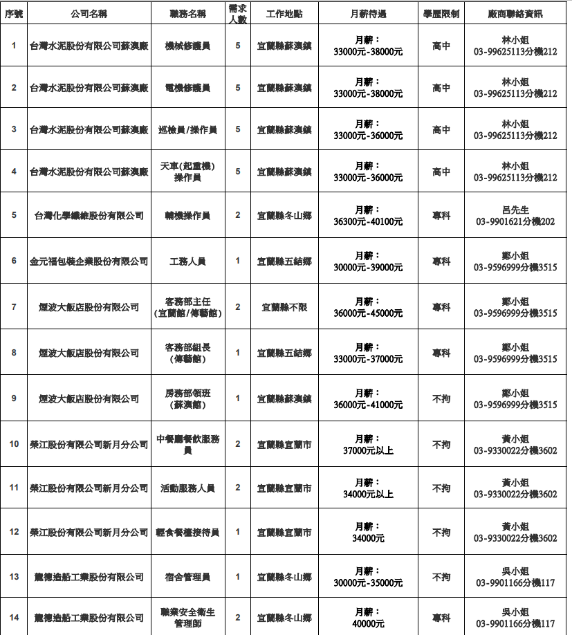 發布日期:114-10-08 資料來源:宜蘭縣榮民服務處 【宜蘭縣榮服處】廠商職缺表(114.10.13) 附件下載 檔案名稱 更新日期 下載次數 【宜蘭縣榮服處】廠商職缺表(114.10.13).pdf 114-10-08 5