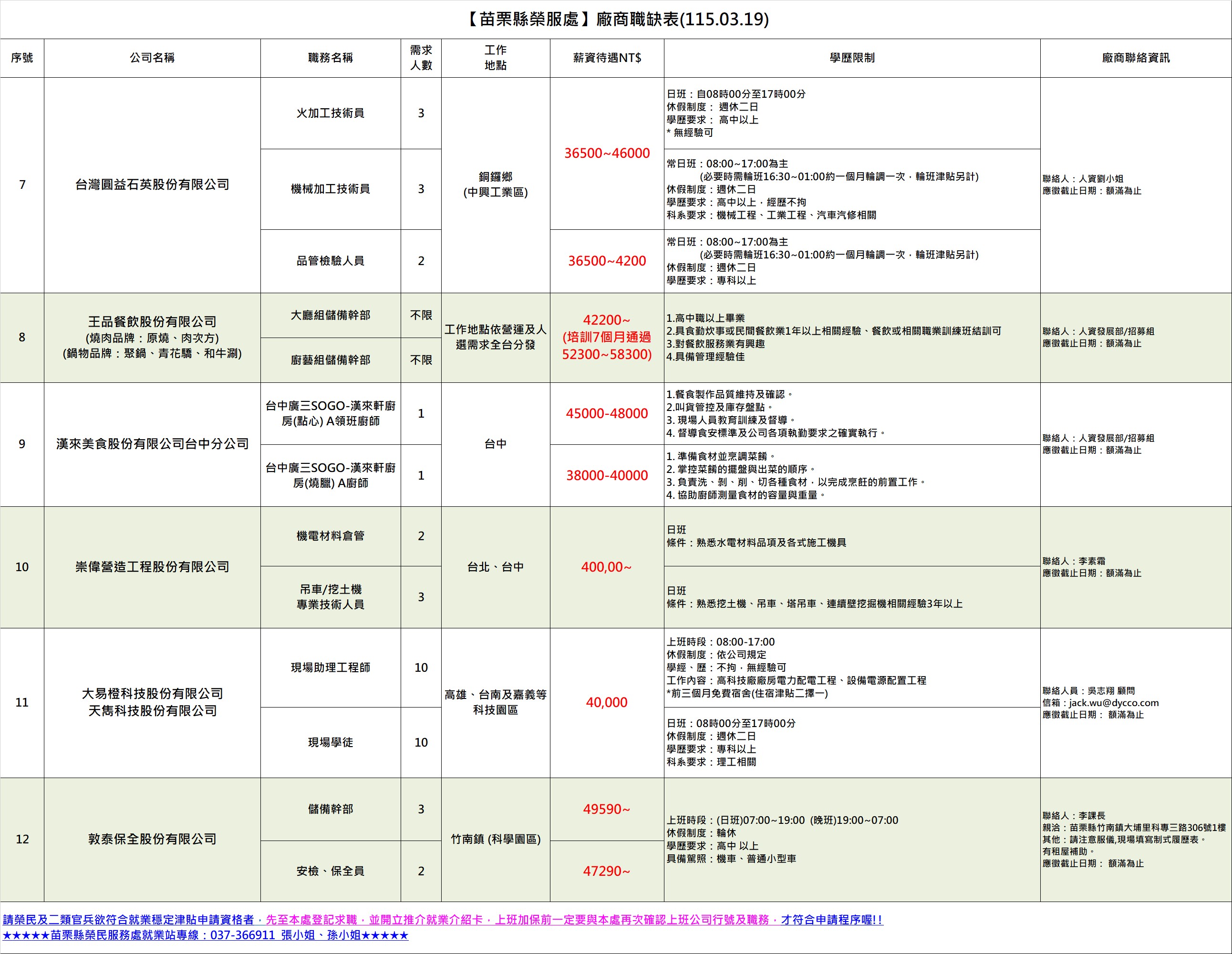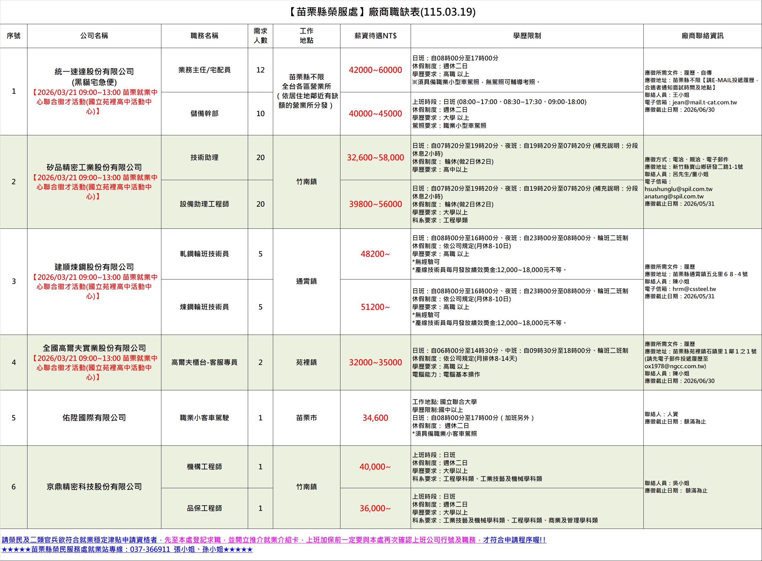 【苗栗縣榮服處】廠商職缺表(115.03.19)