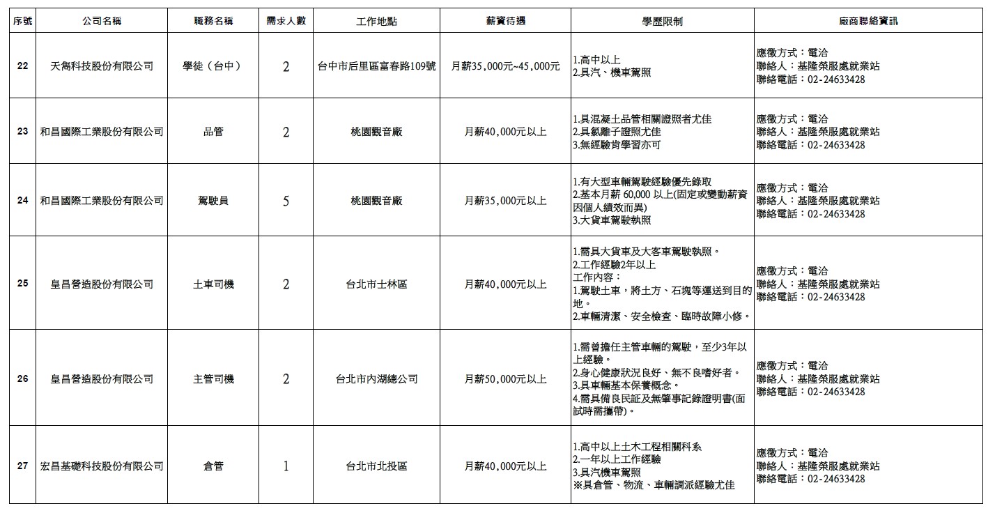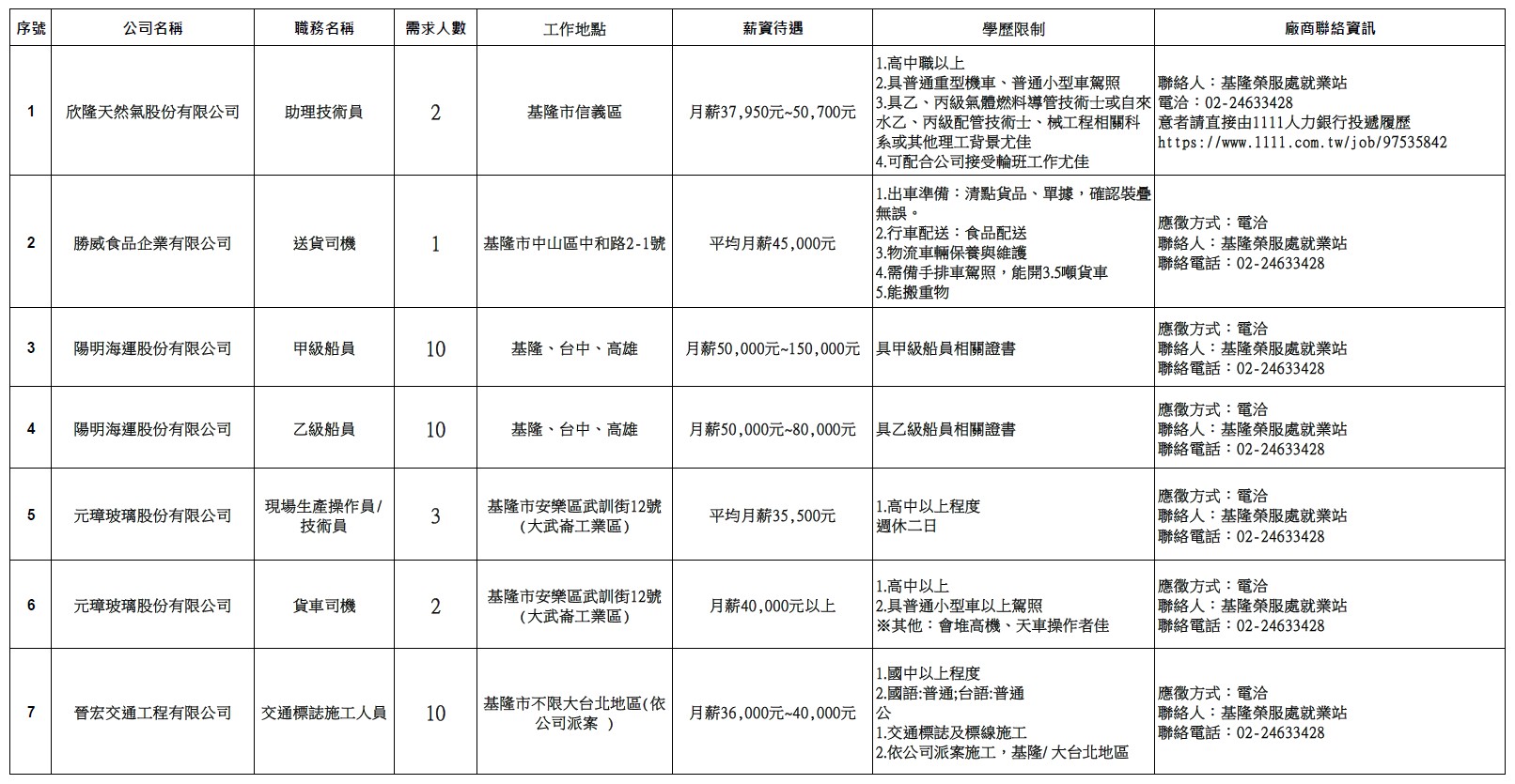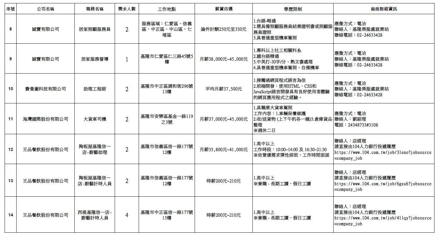 發布日期:114-10-14 資料來源:基隆市榮民服務處 【基隆市榮服處】廠商職缺表(114.10.14)-1 相關照片 【基隆市榮服處】廠商職缺表(114.10.14)-2 【基隆市榮服處】廠商職缺表(114.10.14)-3 【基隆市榮服處】廠商職缺表(114.10.14)-4 【基隆市榮服處】廠商職缺表(114.10.14)-5 【基隆市榮服處】廠商職缺表(114.10.14)-6 【基隆市榮服處】廠商職缺表(114.10.14)-7 附件下載 檔案名稱 更新日期 下載次數 【基隆市榮服處】廠商職缺表(114.10.14).pdf 114-10-14 5