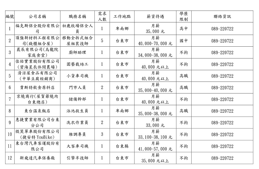 發布日期:114-12-02 資料來源:臺東縣榮民服務處 【臺東榮服處】廠商職缺表_114.12.02 附件下載 檔案名稱 更新日期 下載次數 【臺東榮服處】廠商職缺表_114.12.02.pdf 114-12-02 1