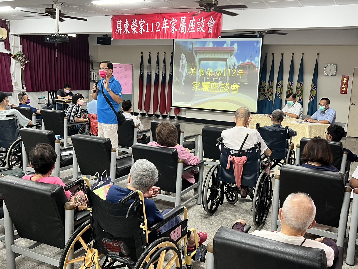 112.06.22下午屏東榮家舉辦端午節家屬座談會,由家主任王少谷親自主持,邀請家屬一起回顧屏東榮家為榮民規劃的各項活動及輔導會微電影〝看見榮民〞,除了播放家區活動影片外,也與家屬進行Q&A,雙向交流回饋、信義堂黃伯伯家屬分享長輩到榮家後的變化,肯定榮家全體員工的用心,看到了父親臉上笑容知道榮家的專業照顧,慶幸自己做了最佳選擇,忘我堂陳伯家屬給予肯定與讚許,榮家如此完善的環境應該開放給予更多有需要的民眾入住。會中家主任均一一回覆,計有112位榮民、家屬、職員工共同參與。 家主任表示最近因為疫情關係暫停家屬座談會,現在疫情趨緩有越來越多家屬來榮家探視家人,榮家環境優美尤其近年來陸續廣植花木,隨著季節不同均有美麗的花木可看,打破安養中心暮氣沉沉的刻板印象,家屬來探視也能在家區走走看看,長輩頤養天年處處美景的榮家,另外也感謝員工用心照顧伯伯並陪同歡度佳節,最後祝福各位端午安康!