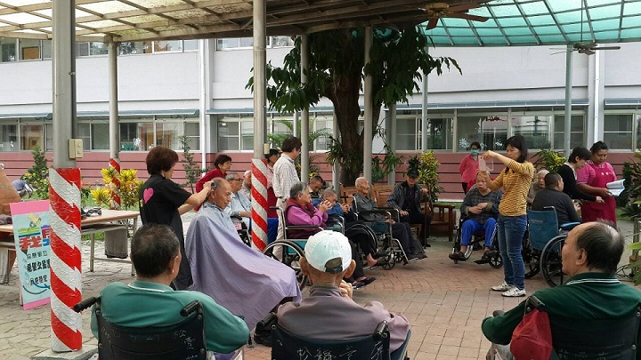 設計師羅言汝(左一)為忠孝堂榮民義剪,堂隊同時結合釣魚課程,家主任(中)與等候的榮民一同活動四肢。