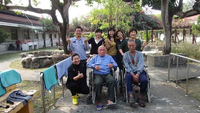家主任(站右二)與蔡萁晏設計師(站右三)一起逗樂忘我堂榮民長輩。