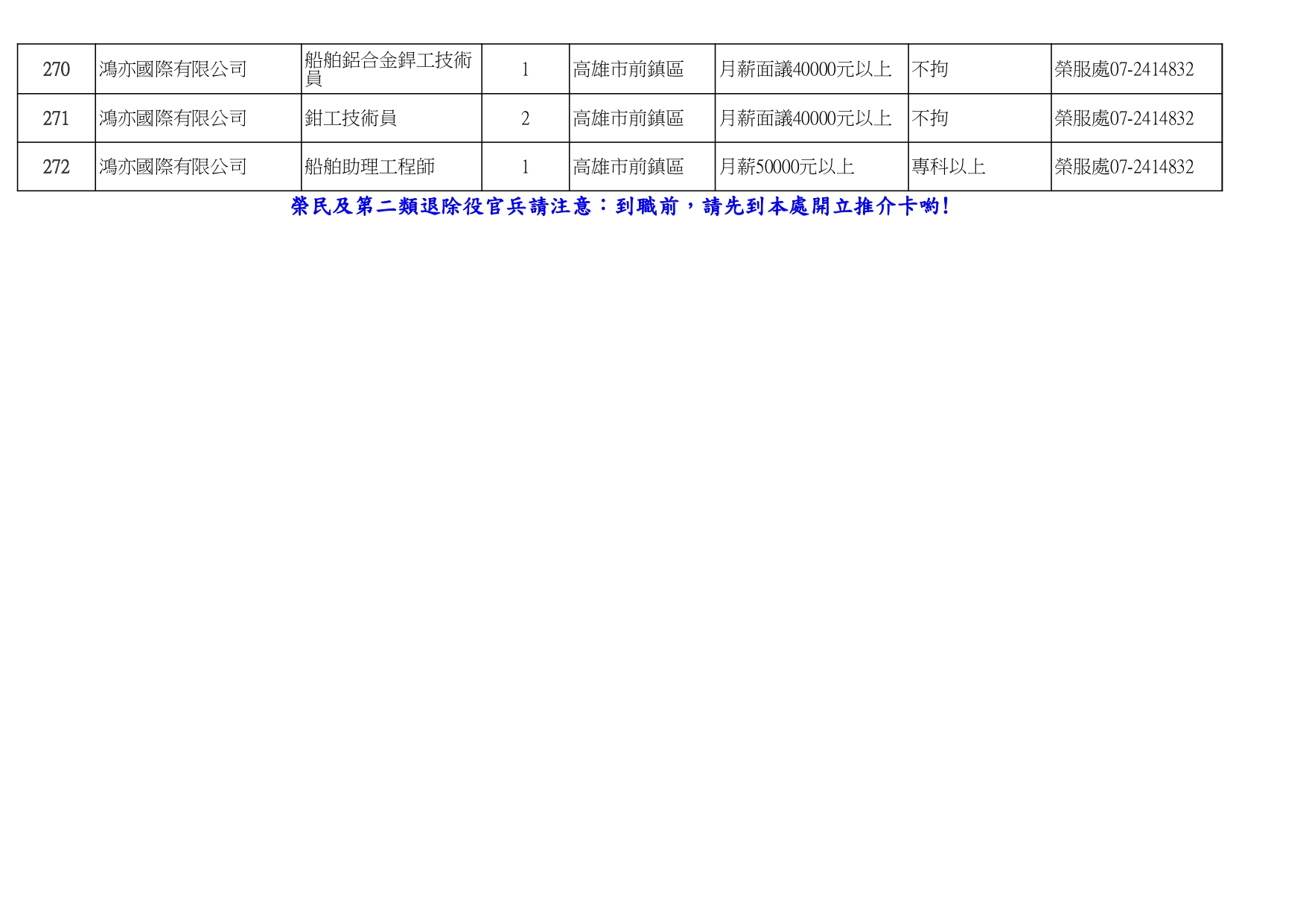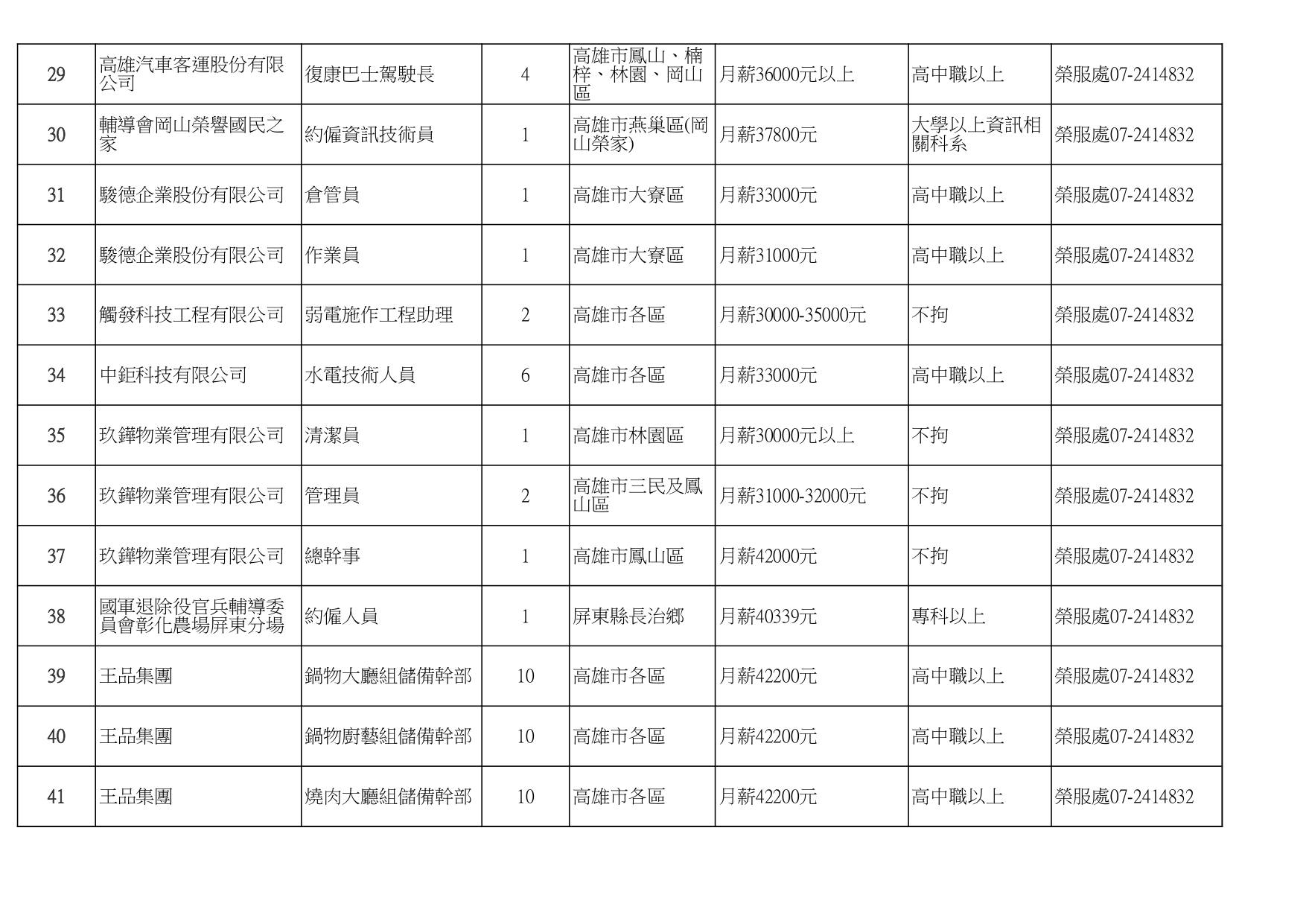 有就業需求之退除役官兵,請把握機會! 如有就(轉)業需求,歡迎洽詢本處就業站(07-2414832)