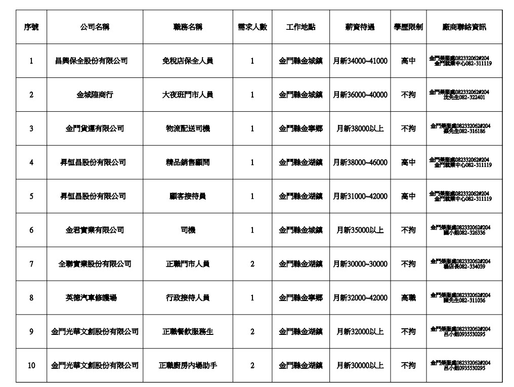 發布日期:114-11-13 資料來源:金門縣榮民服務處 【金門縣榮服處】廠商職缺表(114.11.13) 附件下載 檔案名稱 更新日期 下載次數 【金門縣榮服處】廠商職缺表(114.11.13).pdf 114-11-13 10