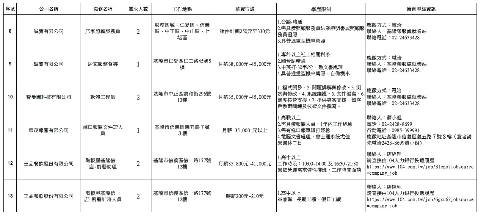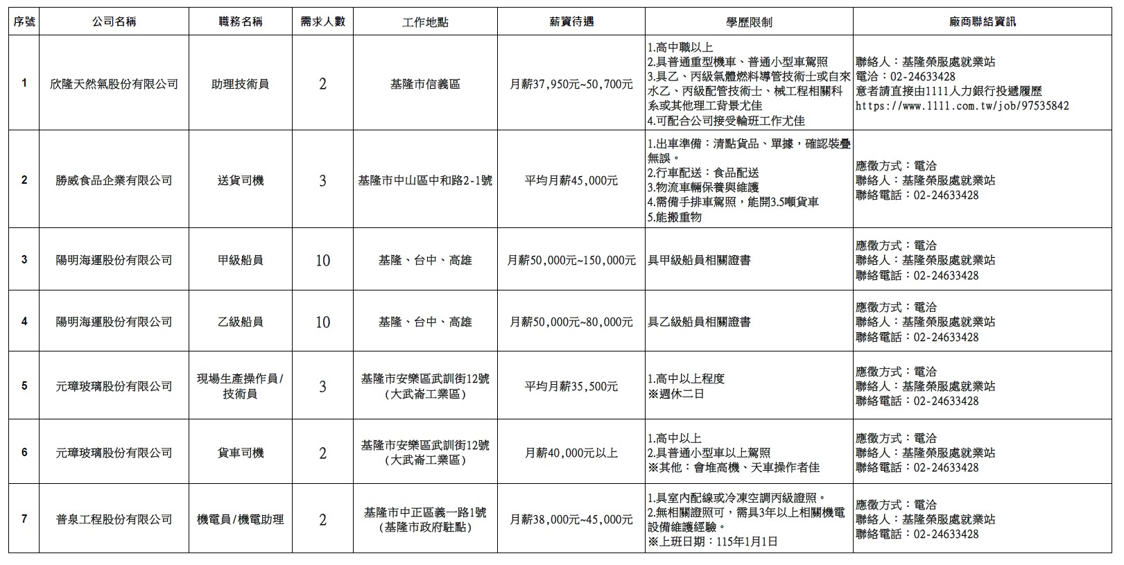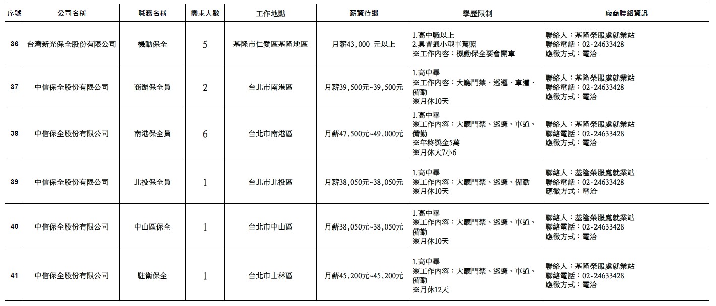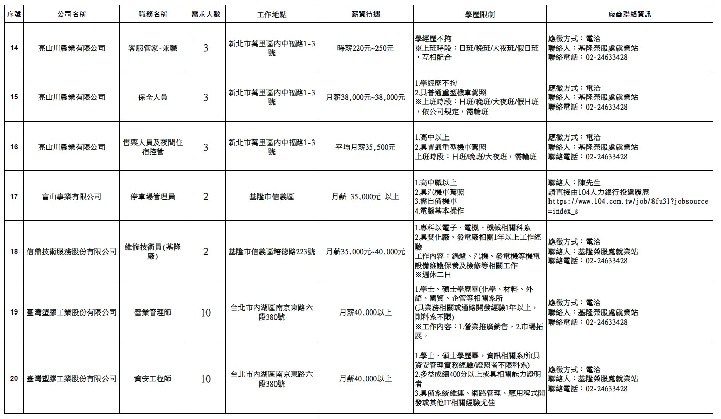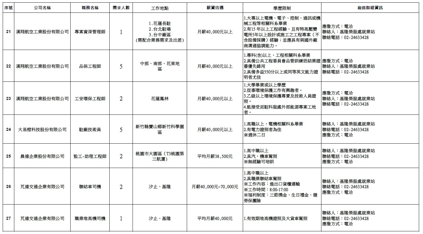 發布日期:114-11-17 資料來源:基隆市榮民服務處 【基隆市榮服處】廠商職缺表(114.11.17)-1 相關照片 【基隆市榮服處】廠商職缺表(114.11.17)-2 【基隆市榮服處】廠商職缺表(114.11.17)-3 【基隆市榮服處】廠商職缺表(114.11.17)-4 【基隆市榮服處】廠商職缺表(114.11.17)-5 【基隆市榮服處】廠商職缺表(114.11.17)-6 附件下載 檔案名稱 更新日期 下載次數 【基隆市榮服處】廠商職缺表(114.11.17).pdf 114-11-17 11