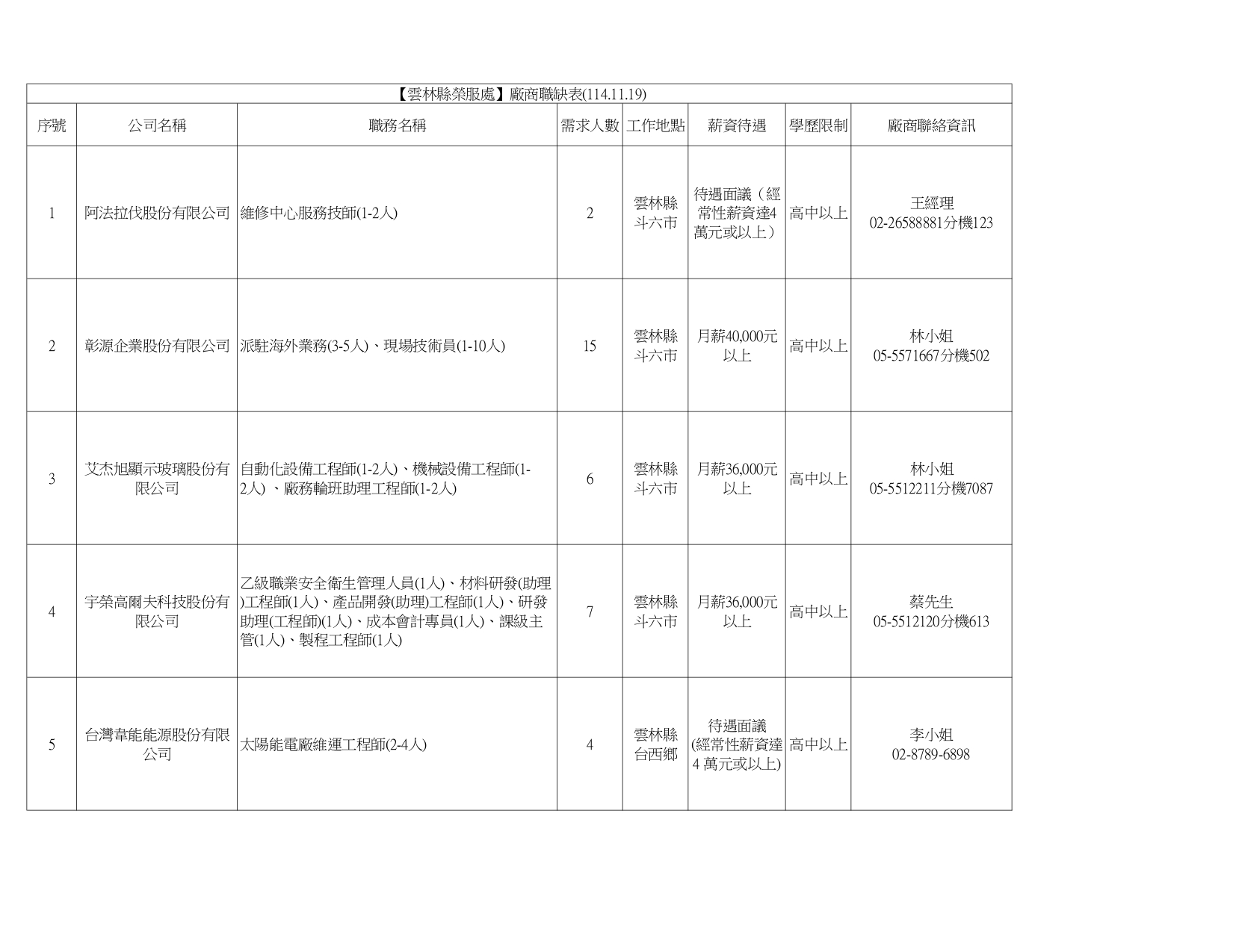 | 【雲林縣榮服處】廠商職缺表(114.11.19)+.pdf | 114-11-19 | 3 |