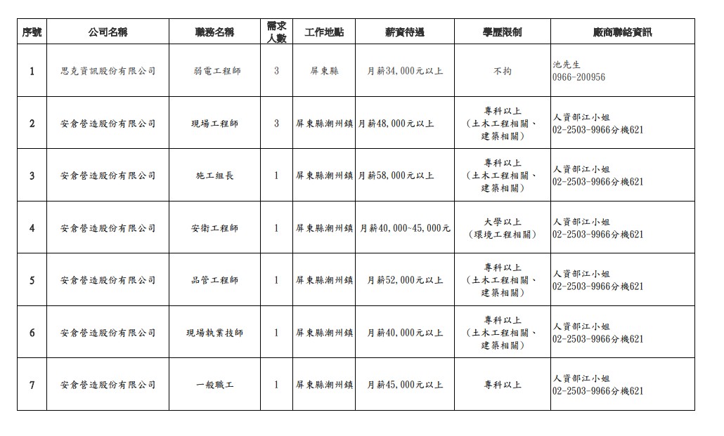 發布日期:114-11-19 資料來源:屏東縣榮民服務處 屏東縣榮服處廠商職缺表(114.11.19) 附件下載 檔案名稱 更新日期 下載次數 屏東縣榮服處廠商職缺表(114.11.19).pdf 114-11-19 5