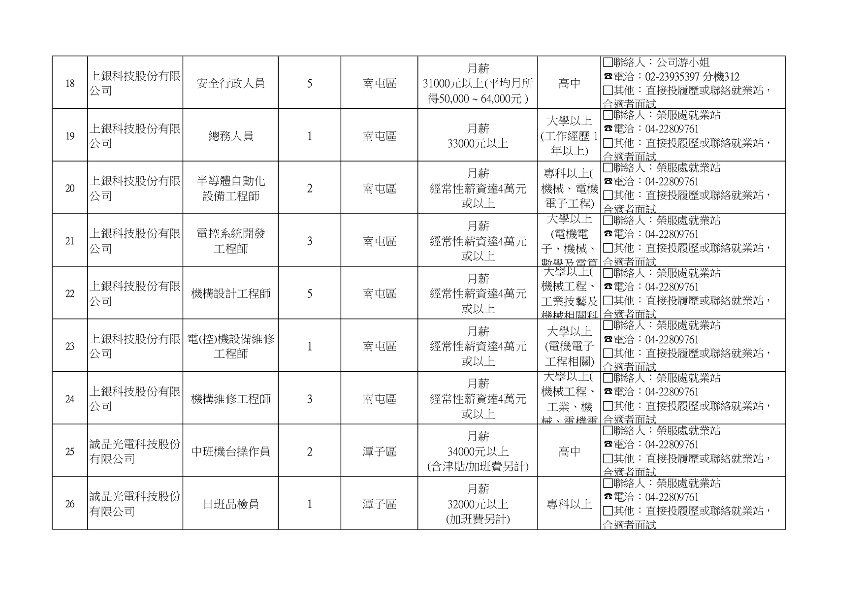 臺中市榮民服務處就業巿場快報(115. 01.06最新廠商職缺表)