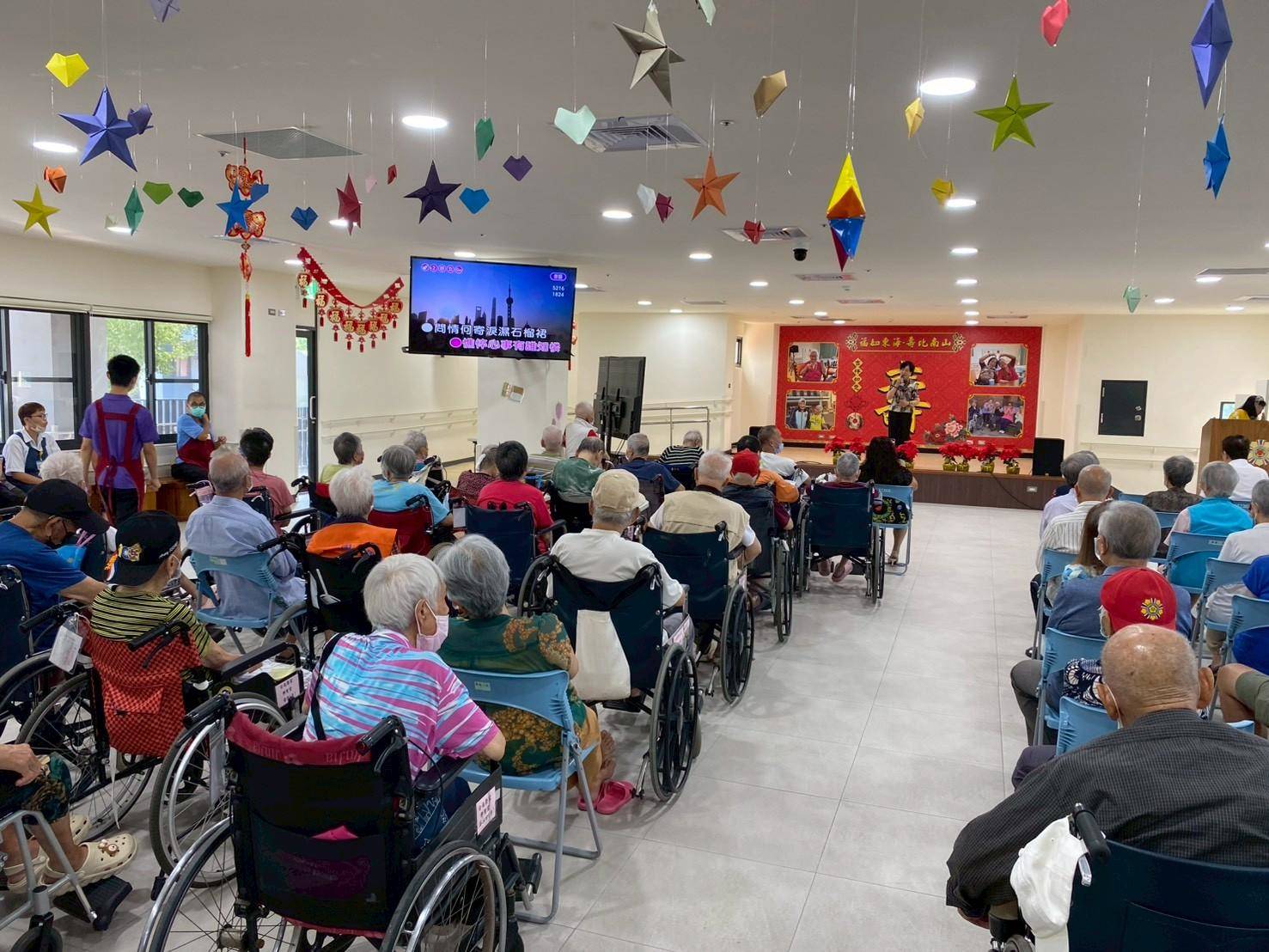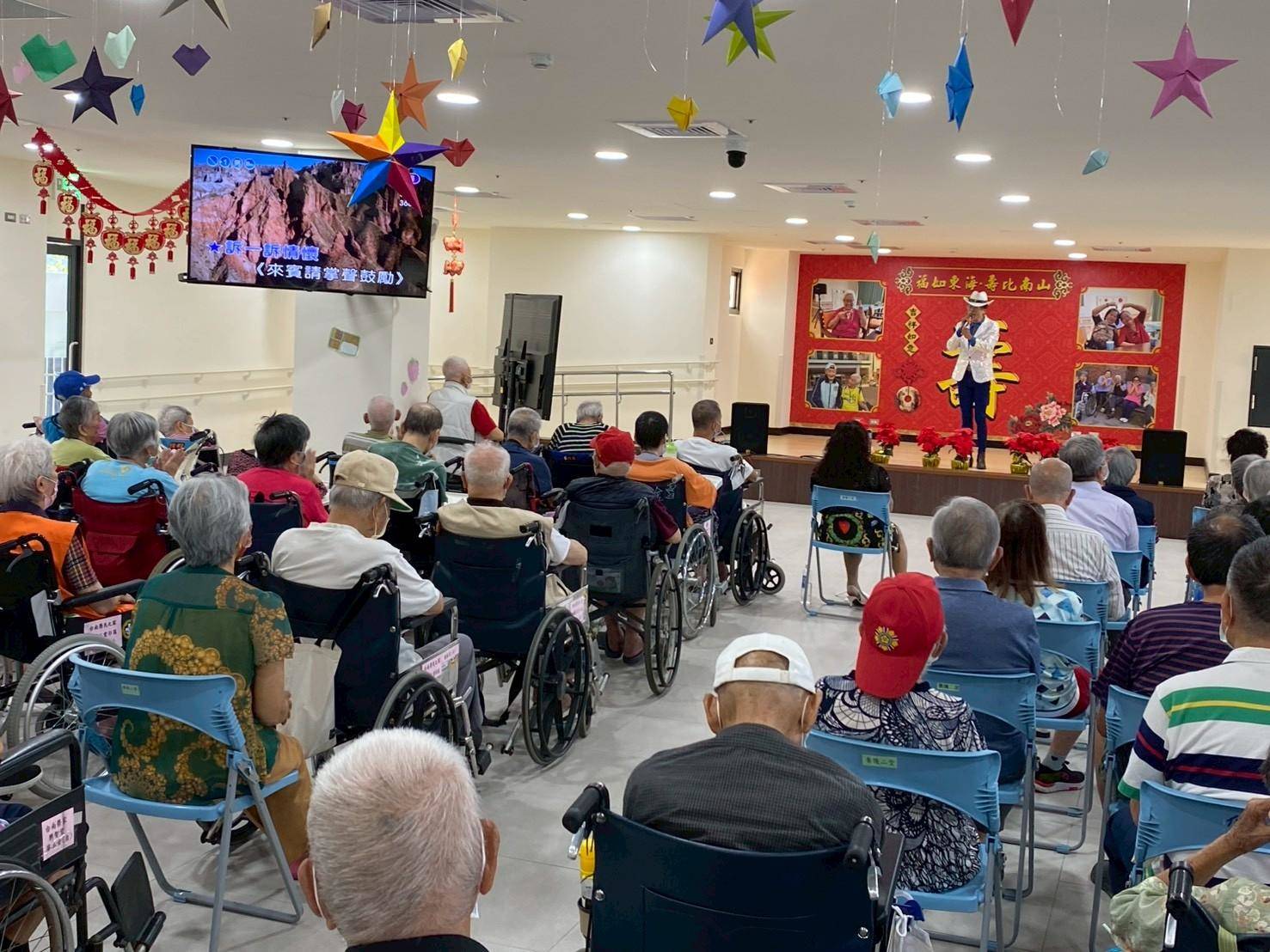 臺南榮家於10月15日舉辦重陽敬老暨公益表演活動,感謝高雄市華夏社會關懷服務協會的貴賓們,為榮家長輩們帶來一場超精彩的歌舞表演! 從氣勢磅礴的《一代女皇》 、深情款款的《昨夜星辰》 ,到活潑熱鬧的《海波浪》 ,每一首都是長輩們的青春,最後的壓軸曲目現場氛圍更是被充滿國旗與熱血的《中華民國頌》 推向最高潮,掌聲和喝采聲不斷,活動會後由臺南榮家同仁致贈襪子禮盒,祝長輩們重陽節快樂。 感謝華夏社會關懷服務協會的用心與關懷,讓長輩們提前感受到滿滿的社會溫暖與節日氣氛。臺南榮家也會繼續努力,讓榮家成為長輩們最幸福、最樂齡的家!