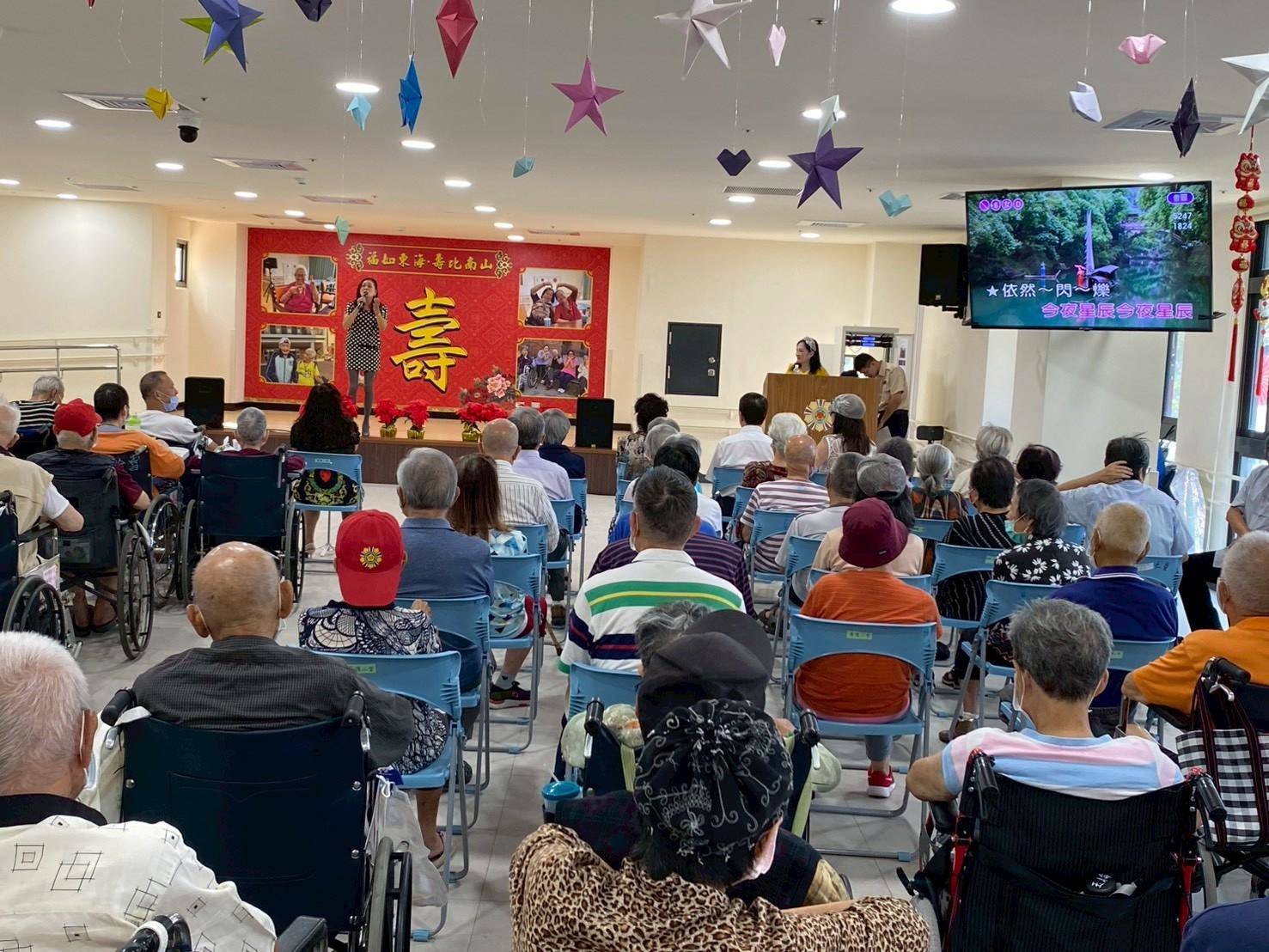 臺南榮家於10月15日舉辦重陽敬老暨公益表演活動,感謝高雄市華夏社會關懷服務協會的貴賓們,為榮家長輩們帶來一場超精彩的歌舞表演! 從氣勢磅礴的《一代女皇》 、深情款款的《昨夜星辰》 ,到活潑熱鬧的《海波浪》 ,每一首都是長輩們的青春,最後的壓軸曲目現場氛圍更是被充滿國旗與熱血的《中華民國頌》 推向最高潮,掌聲和喝采聲不斷,活動會後由臺南榮家同仁致贈襪子禮盒,祝長輩們重陽節快樂。 感謝華夏社會關懷服務協會的用心與關懷,讓長輩們提前感受到滿滿的社會溫暖與節日氣氛。臺南榮家也會繼續努力,讓榮家成為長輩們最幸福、最樂齡的家!