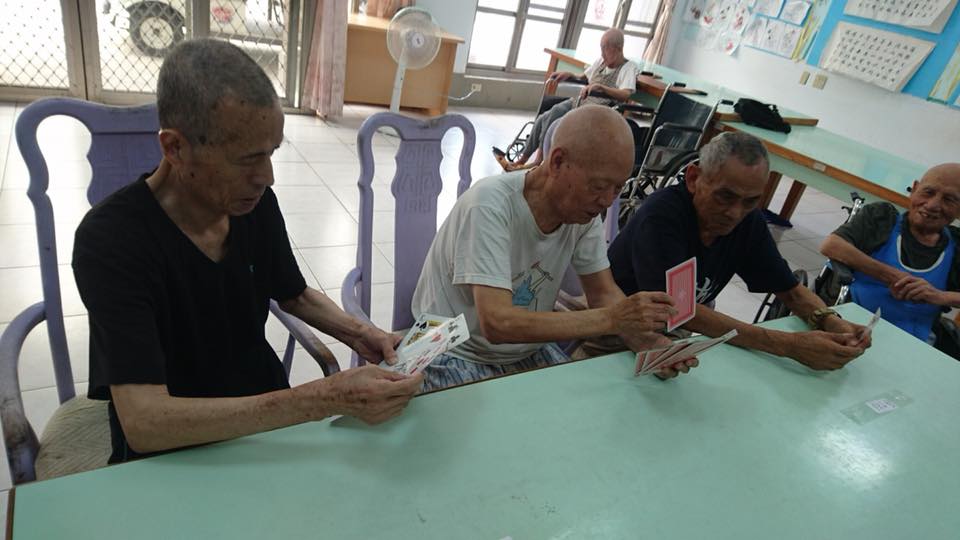 北榮職能治療師許老師,帶動忘我園區的伯伯們牌藝遊戲治療。