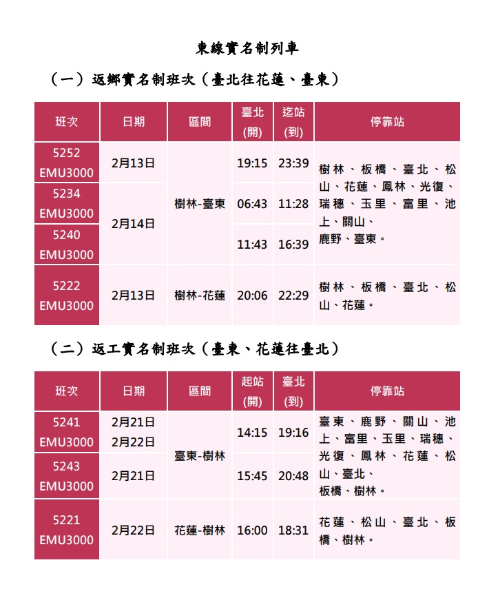 臺鐵公司115年春節假期東部幹線尚有餘位,敬請旅客多加利用