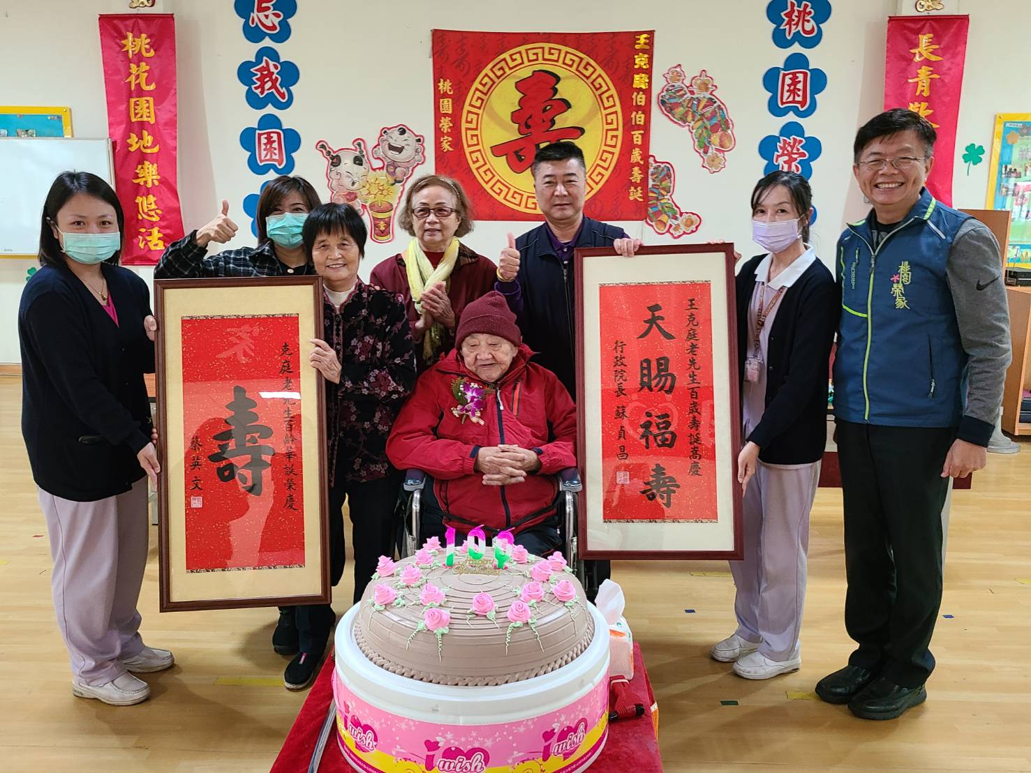 桃園榮家12月份有1位百歲的壽星王克庭伯伯。 109年12月18日本家為王伯伯安排百歲壽誕慶生,特別結合報佳音活動舉辦溫馨熱鬧的百歲祝壽誕辰活動以及準備精緻的大蛋糕、壽桃、壽麵等茶點來為伯伯慶生,並由榮家大家長陳平主任頒贈總統蔡英文壽屏、行政院長蘇貞昌百歲壽屏,以及輔導會主委馮世寬委員致贈的金壽桃項鍊,為伯伯獻上祝福之意,適逢聖誕節將至,財團法人天主教聖保祿修女會醫院特地選在今日蒞臨榮家進行報佳音活動,由牧靈志工帶來「平安與你同在」舞蹈表演及「耶穌在敲門」帶動唱,一方面祝福長輩生日快樂、平安喜樂;另一方面也讓在場長輩歡度慶生之餘感受濃濃過節氣氛,為現場增添不少歡樂氣氛。家主任陳平先生表示:祝福王伯伯生日快樂,也感謝財團法人天主教聖保祿修女會醫院長期前來關懷照顧長輩,同時提醒現場照顧服務人員,近日氣候變化急遽,日夜溫差大,為長輩添加衣物,注意保暖,也祝福在場每位長輩身體健康,生活愉快。