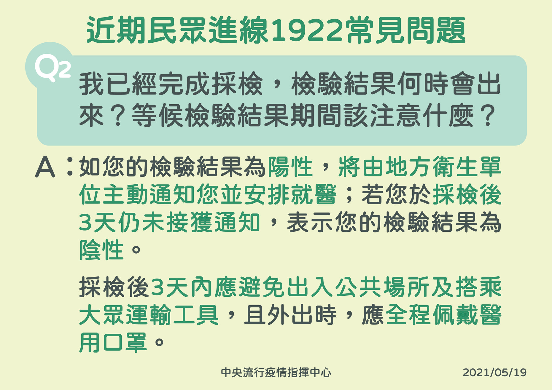 Q2:我已經完成採檢,檢驗結果何時會出來等候檢驗結果期間該注意什麼?