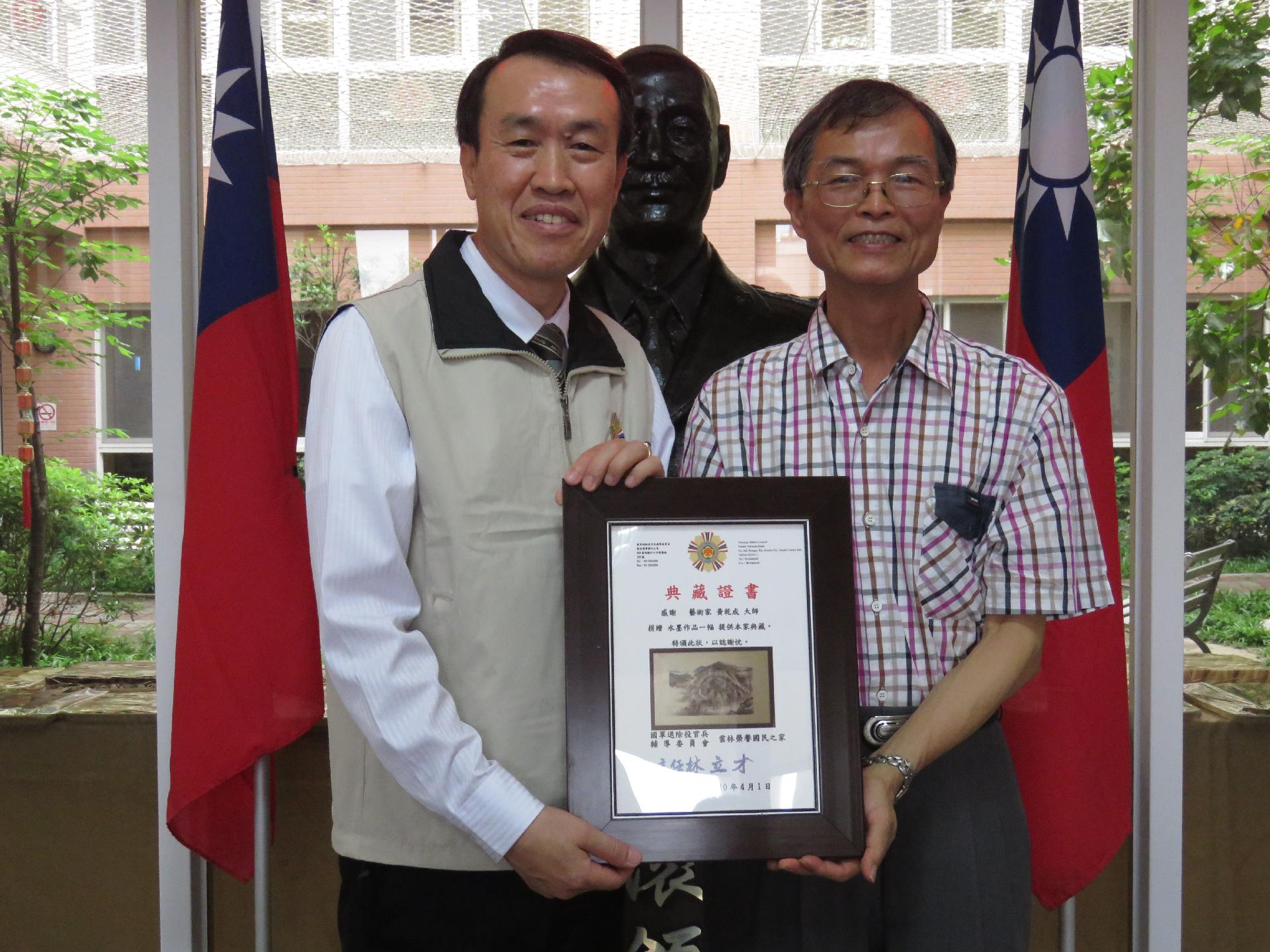 上期之「黃乾成大師水墨創作展」,深獲地方藝文、住民及家屬好評,創作者黃乾成大師亦出席本次活動,於今日特贈與一幅水墨創作予榮家典藏。家主任林立才分別頒贈典藏證書及感謝狀給黃乾成大師及林志祥大師,感謝他們以豐沛的藝術力量嘉惠榮家住民。