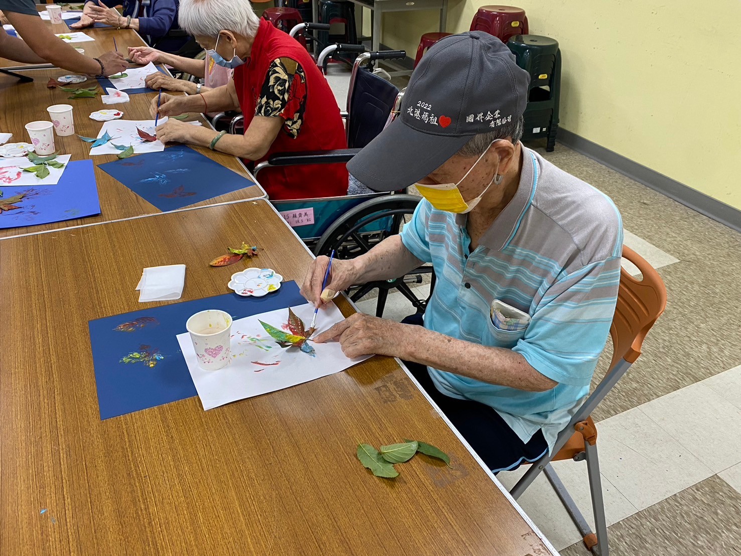 本家與農業試驗所花卉試驗分所合作推動園藝輔療計畫,此次主題為拓印DIY。 由綠森微風工作室-石軒豪老師帶領住民利用葉片塗上由長者調色的顏料後,拓印在色紙上,最後灑上亮色系顏料。同時可訓練手眼協調能力。住民在的過程中充分抒發情緒同時刺激手指小肌肉。 活動充分刺激住民手指小肌肉耐力,促進住民感官刺激,不僅有助於提升長者的身體健康,也為他們的心理帶來正面影響。 透過手工藝品活動增進住民與大自然的連結,讓住民們度過愉快時光。