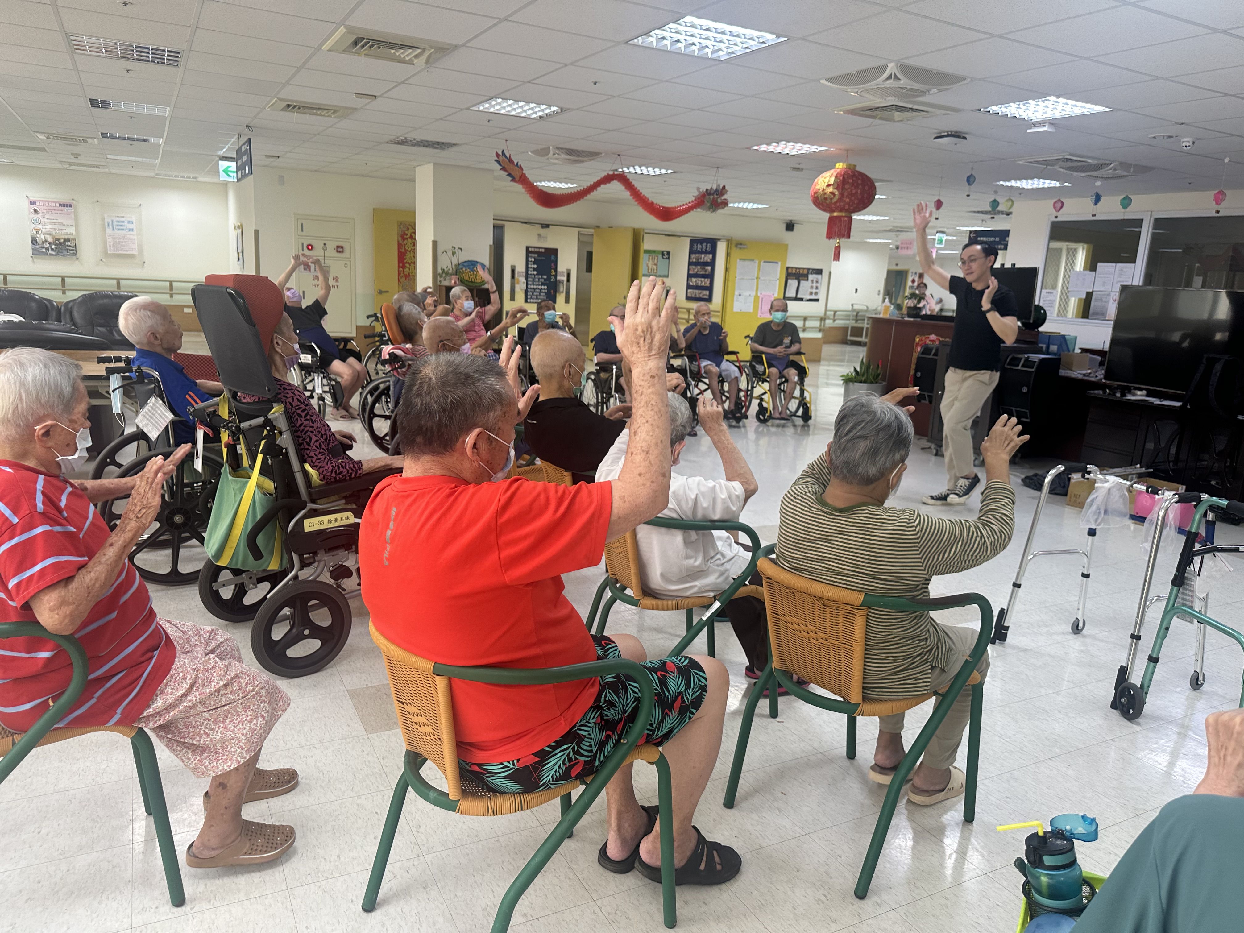 在失智症照護中,**非藥物治療**被廣泛視為安全且有效的輔助方式,能改善住民的生活品質,本家與台中榮總嘉義分院合作辦理失智症住民非藥物之整合性照護講座,今天講師至忠孝堂及仁愛堂教導規律運動可促進腦內血液循環與氧氣供應,減緩腦細胞老化。運動能增加腦內神經滋養因子(BDNF),幫助神經細胞修復與新生,總結來說,運動不只是強身健體,更能成為失智症預防與延緩的重要方法。