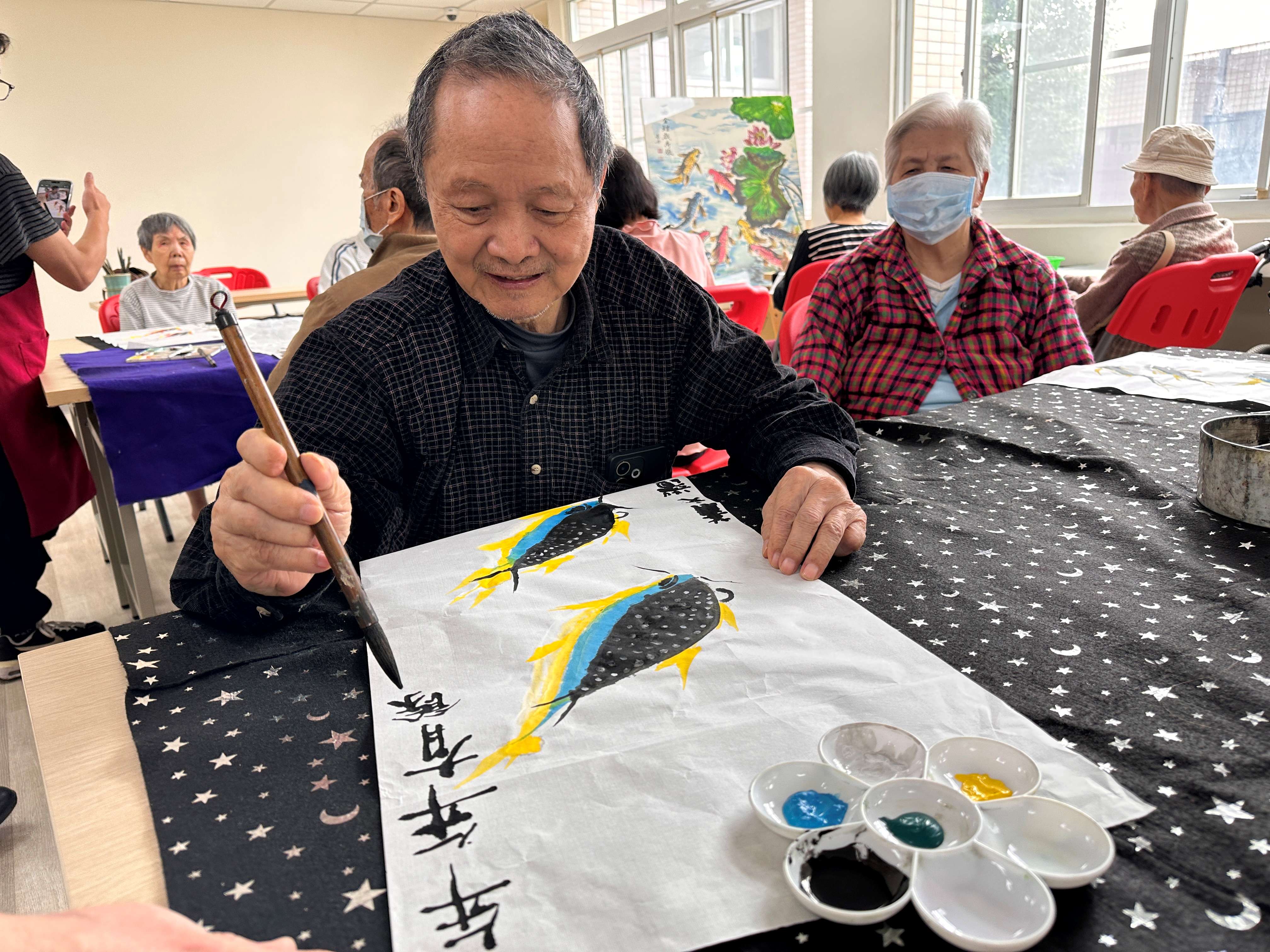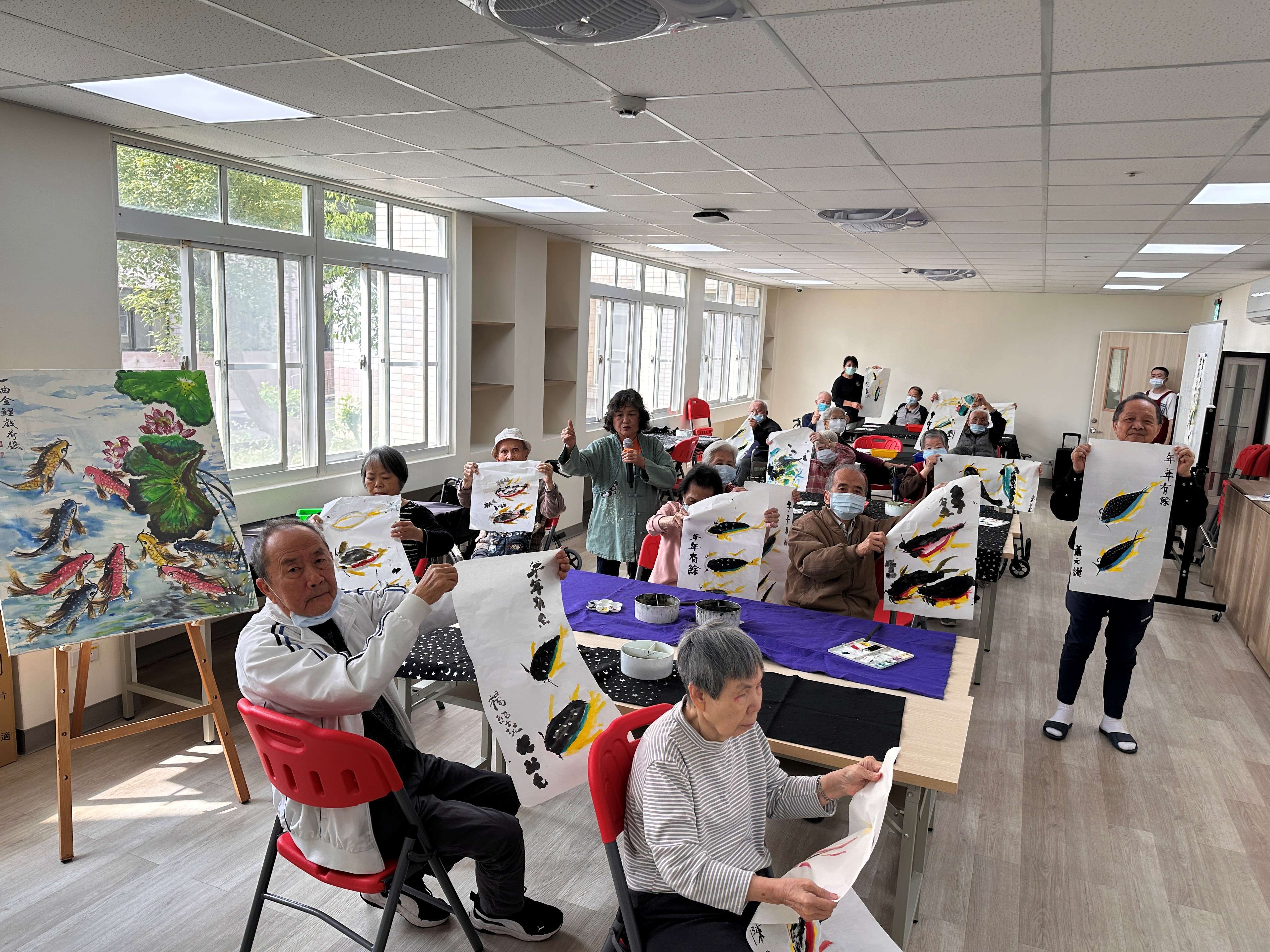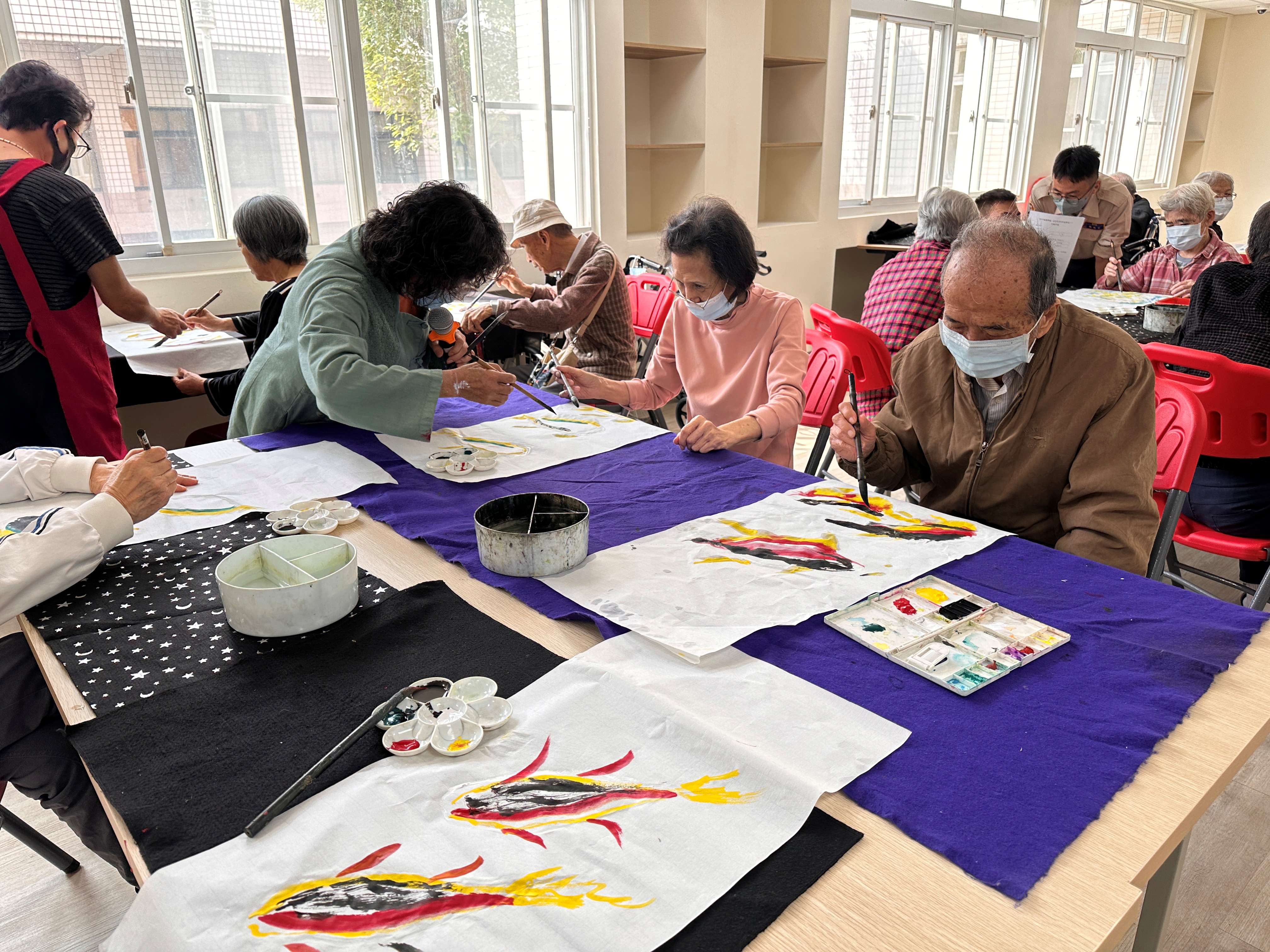 本次課程邀請黃素丹老師帶領長輩透過繪畫進行藝術創作。長輩們在老師細心引導下,以畫筆勾勒出一幅幅充滿生命力的作品,過程中不僅沉浸於創作的樂趣,也讓心情逐漸放鬆與愉悅。 繪畫活動能幫助長輩抒發情緒,減少憂鬱與焦慮感,並在專注創作的過程中進入「心流」狀態,提升成就感與自信心,同時也促進彼此之間的交流與互動。 此外,透過畫筆的運用,也能刺激手部精細動作,對於延緩認知功能退化具有正向助益。 在溫暖愉快的氛圍中,長輩們完成了一幅幅象徵 「鯉躍龍門」 的作品,也為生活增添了滿滿的成就感與色彩。
