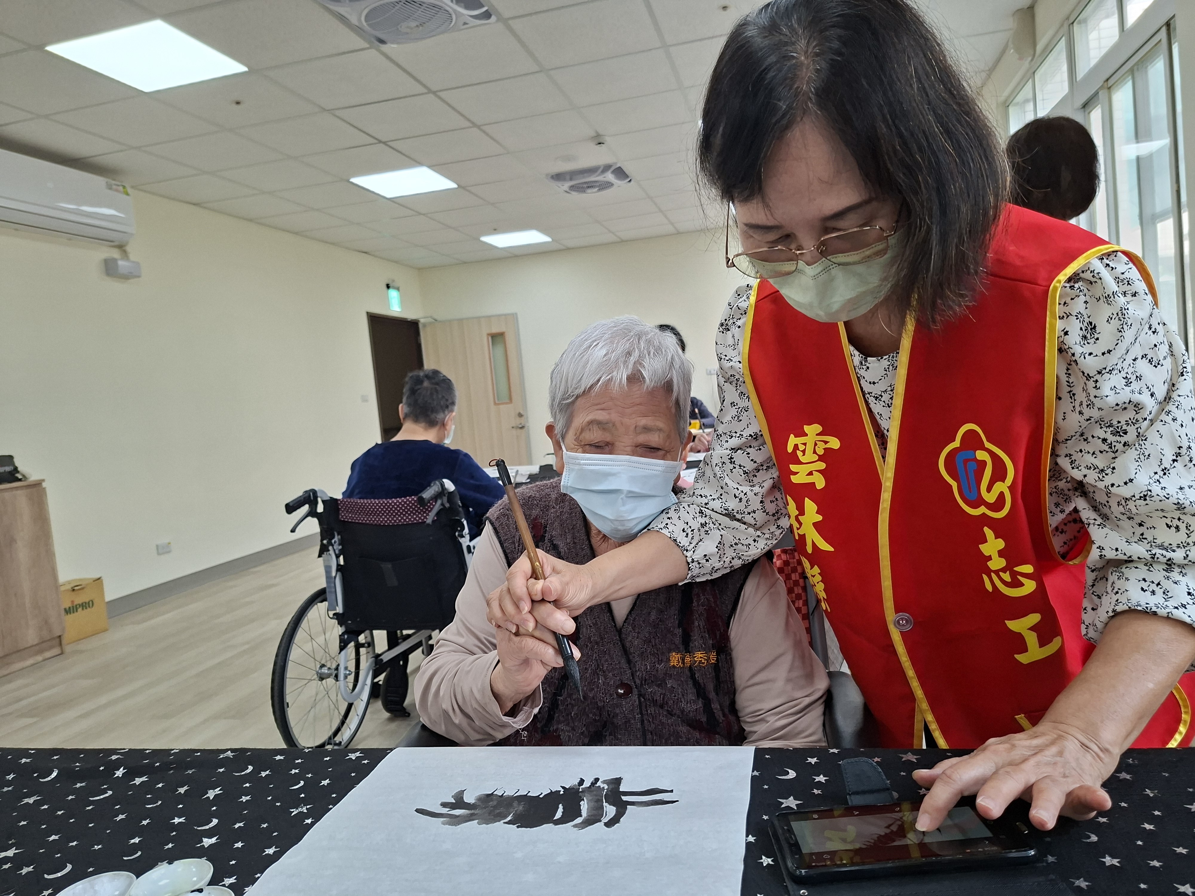 志工耐心的陪伴戴奶奶畫畫