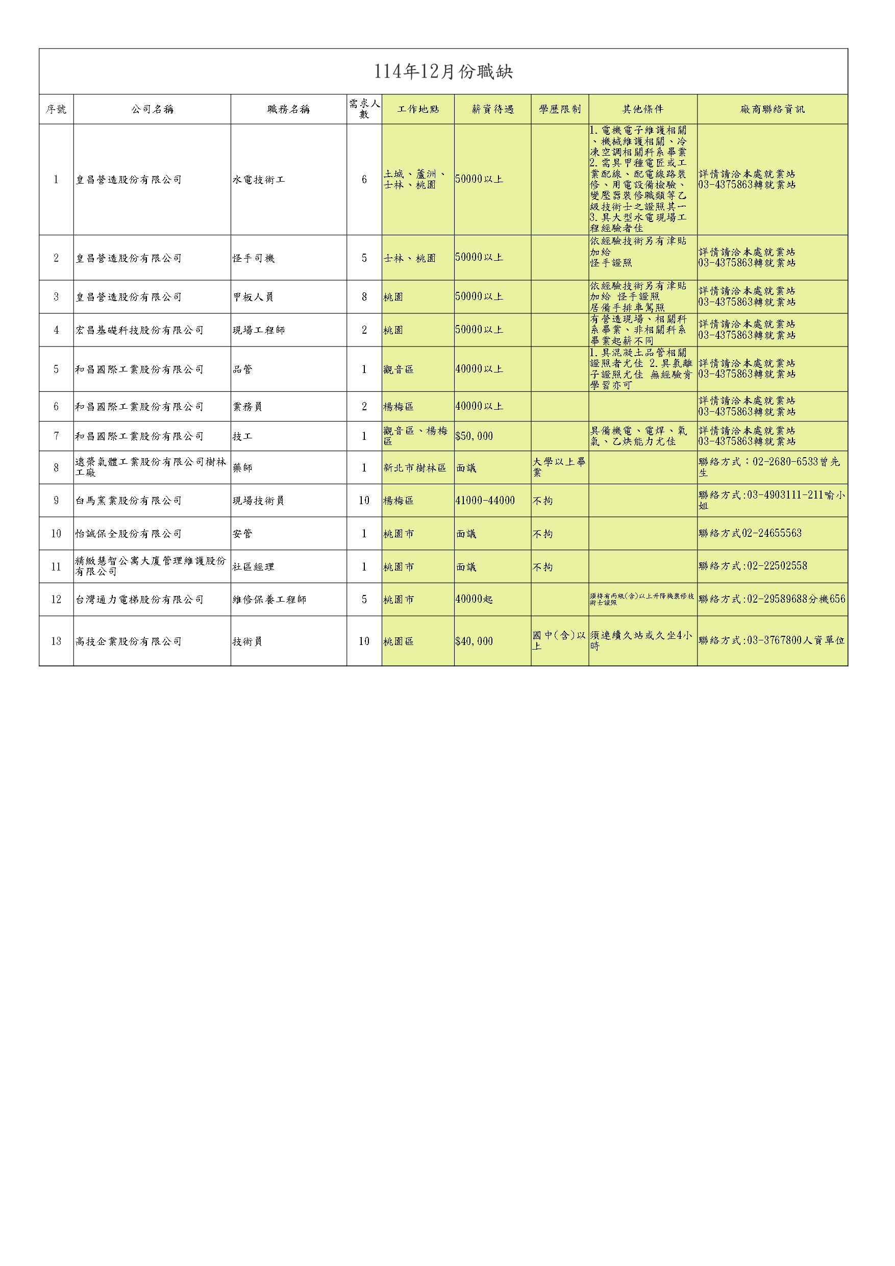 【桃園市榮服處】廠商職缺表(114.12.1)