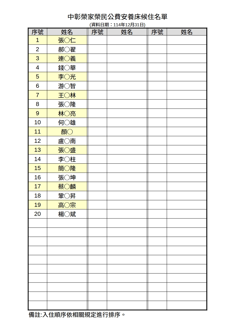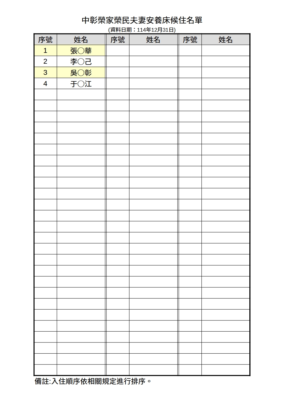 中彰榮家115年1月份候住名單-榮民夫妻安養